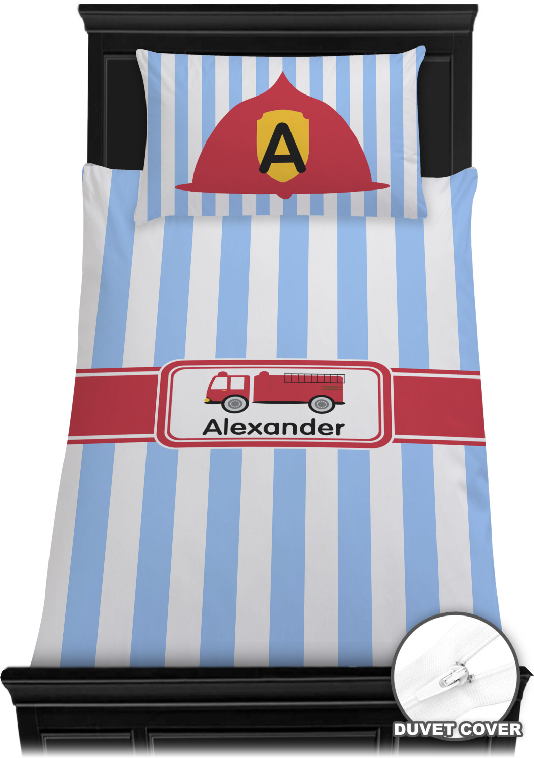What little boy doesn't dream about growing up and becoming a fire fighter? Set on a classic striped blue and white background, this design featuring a snazzy firetruck is perfect for your little fireman-to-be.