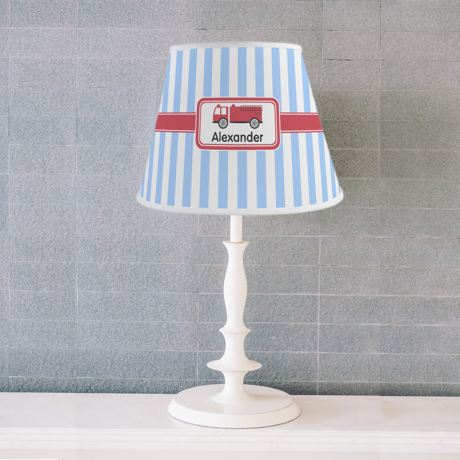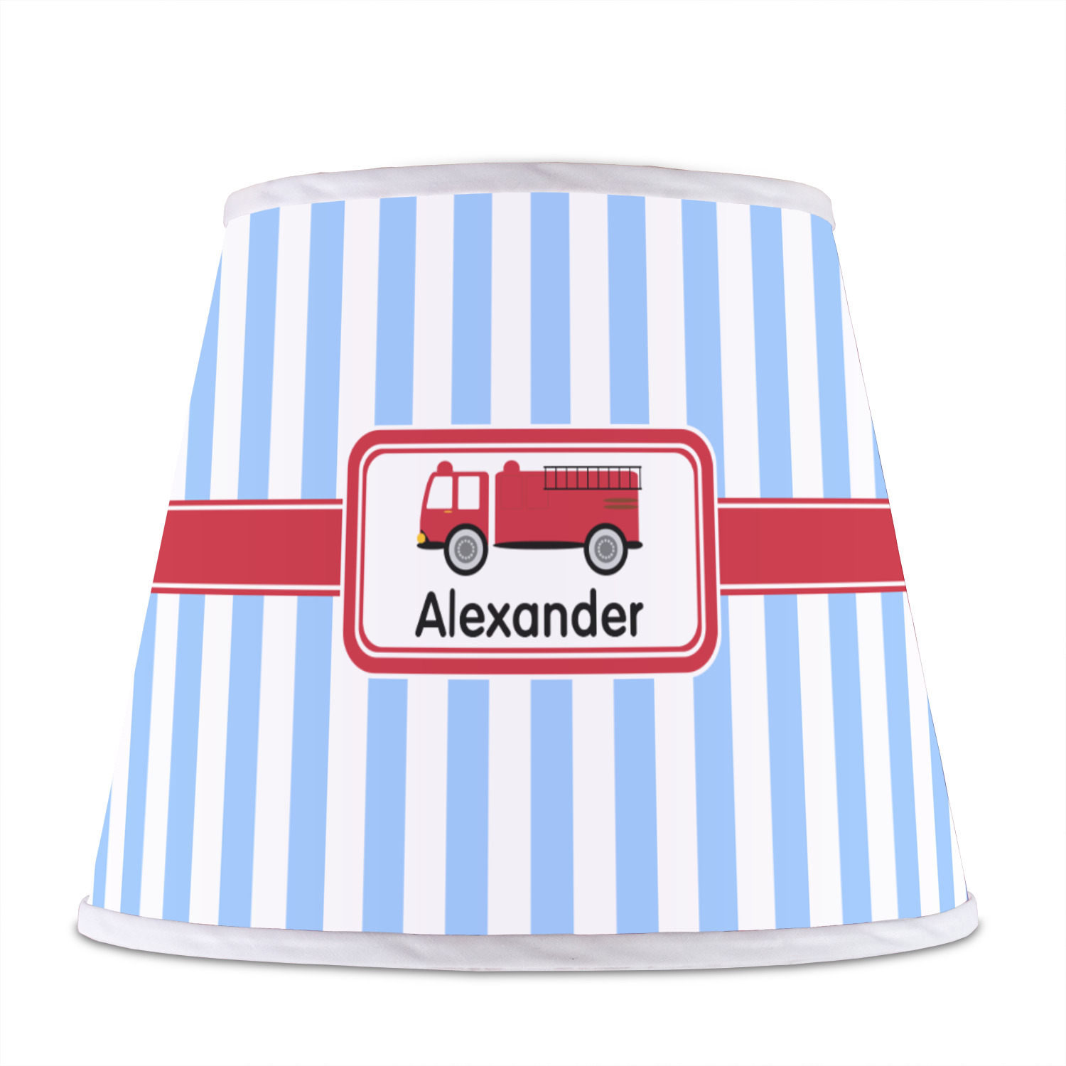 What little boy doesn't dream about growing up and becoming a fire fighter? Set on a classic striped blue and white background, this design featuring a snazzy firetruck is perfect for your little fireman-to-be.