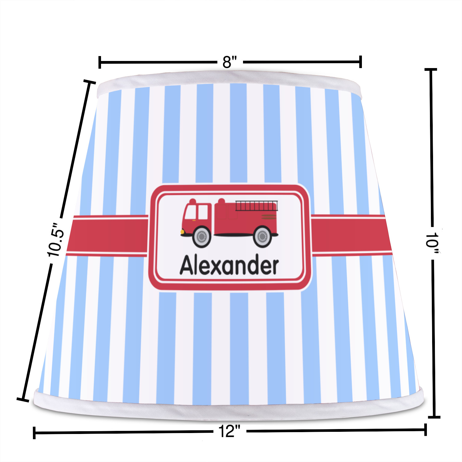 The base of this lampshade is 12 inches in diameter, and the top spans 8 inches in diameter. The total height of the lampshade is 10 inches. The angled nature of this custom lampshade concentrates the light, making it ideal for smaller spaces. This lampshade is made of matte, polyfilm, and displays your customization in its middle. The top and bottom of this colorful lamp shade are lined with a white fabric ribbon (which can be replaced with black inside the design studio) which frames your design and creates a sophisticated finish. As an UNO fitter lampshade, this unique lamp shade will fit a variety of bases.