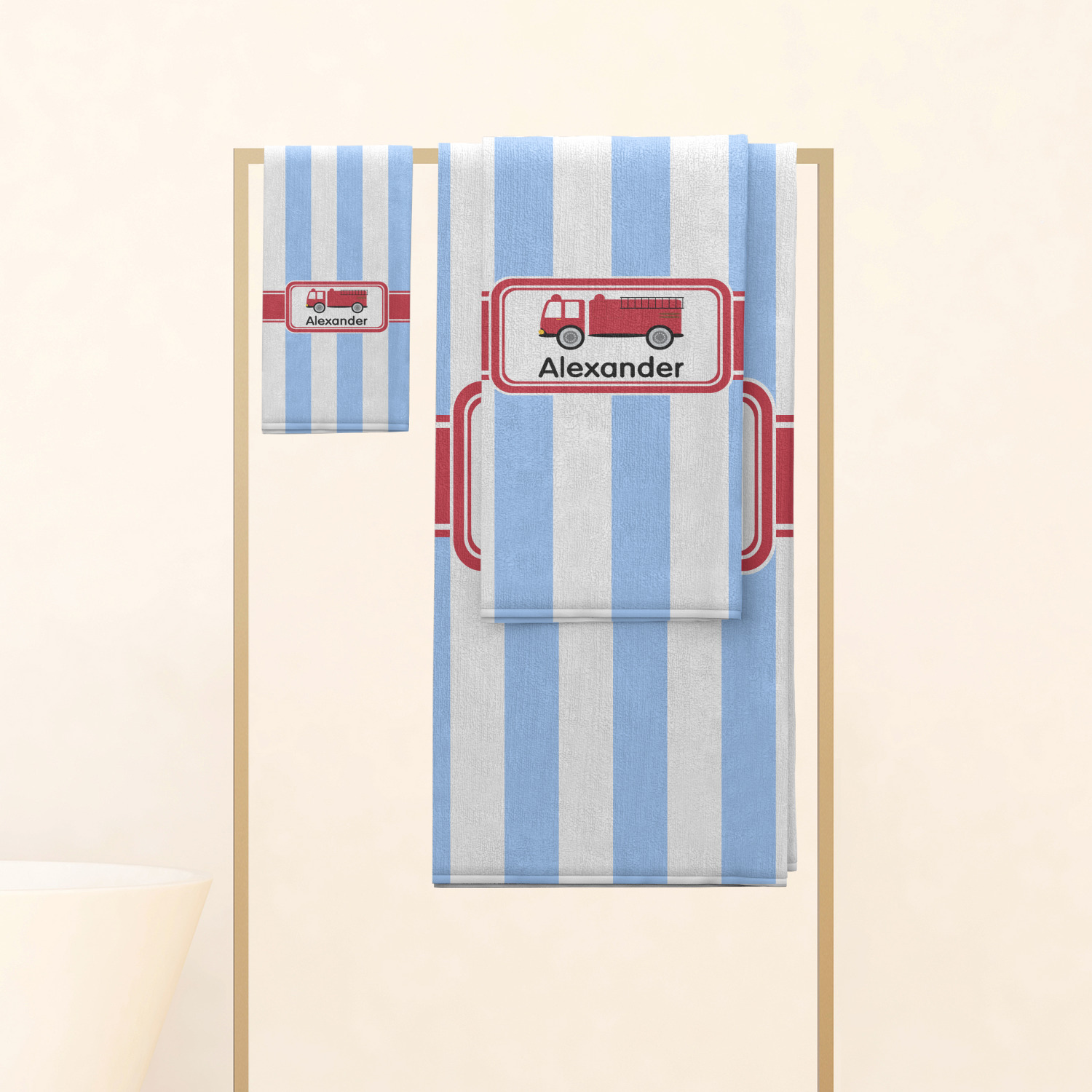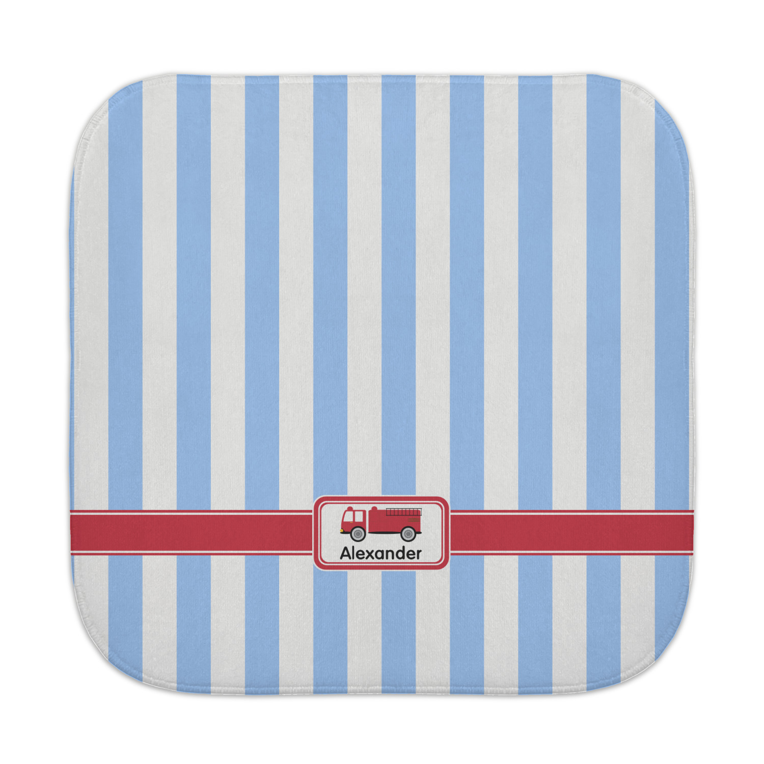 What little boy doesn't dream about growing up and becoming a fire fighter? Set on a classic striped blue and white background, this design featuring a snazzy firetruck is perfect for your little fireman-to-be.