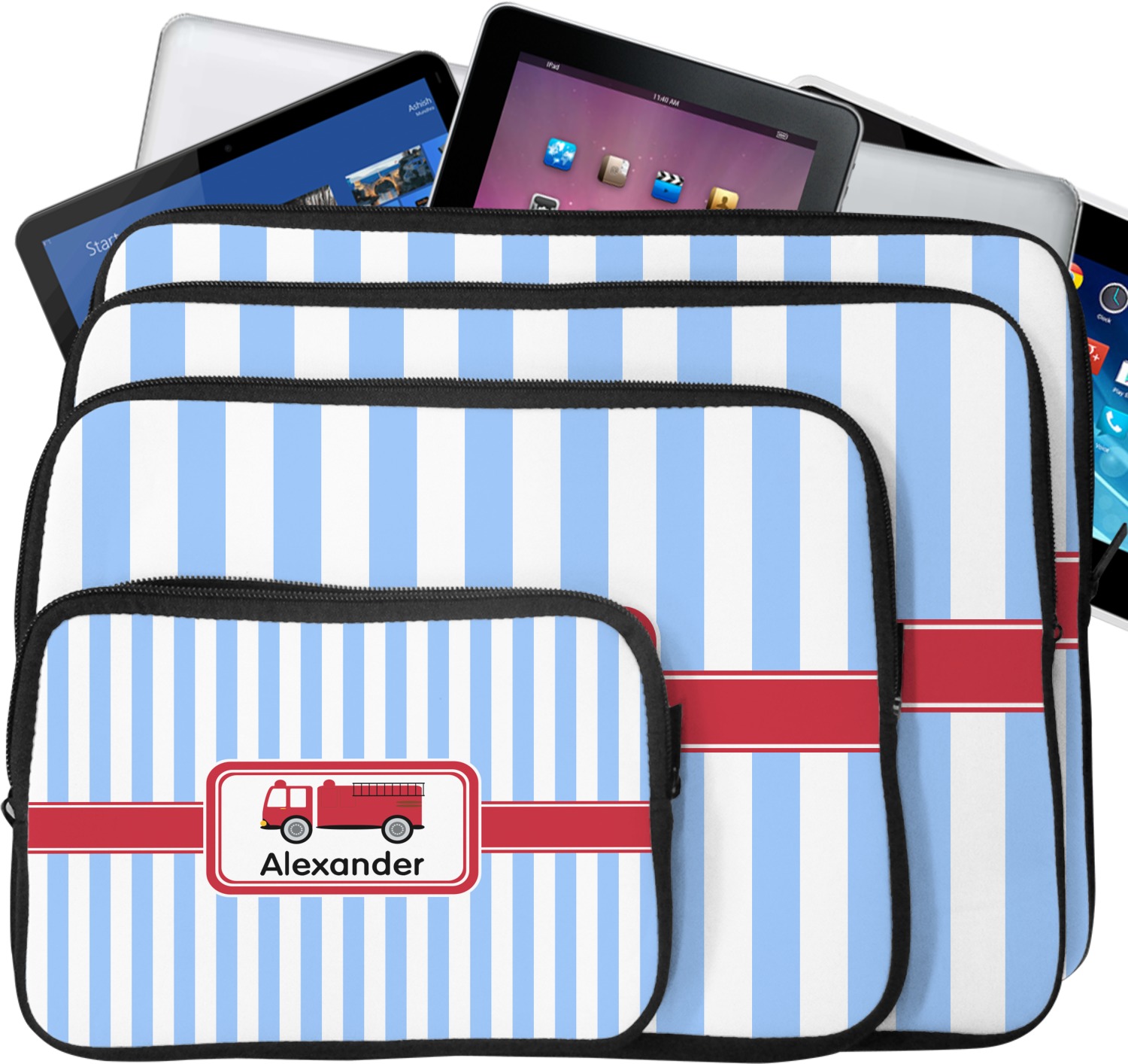 These laptop covers are built from a water-resistant, cushioned neoprene. We display your personalized design on the front of this computer sleeve, while the other sides are simply the black color of the neoprene fabric. A zipper lines the top half of this case, for direct access to your device. For added protection, the interior of this neoprene laptop sleeve is lined with a padded, minky-like material.