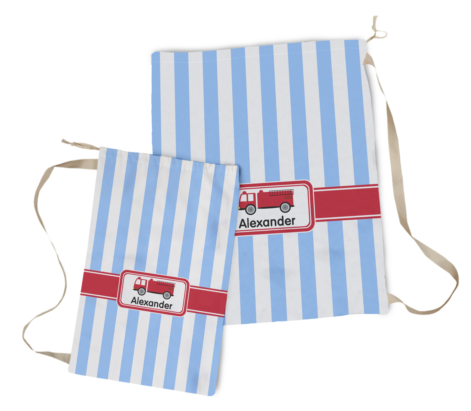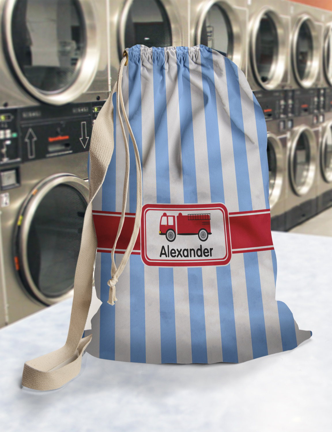 Carry your laundry in style with these customized laundry bags. Available in two sizes, featuring a natural colored woven strap and a cinch cord, these bags hold a lot of clothes or anything else you want to fit in them.