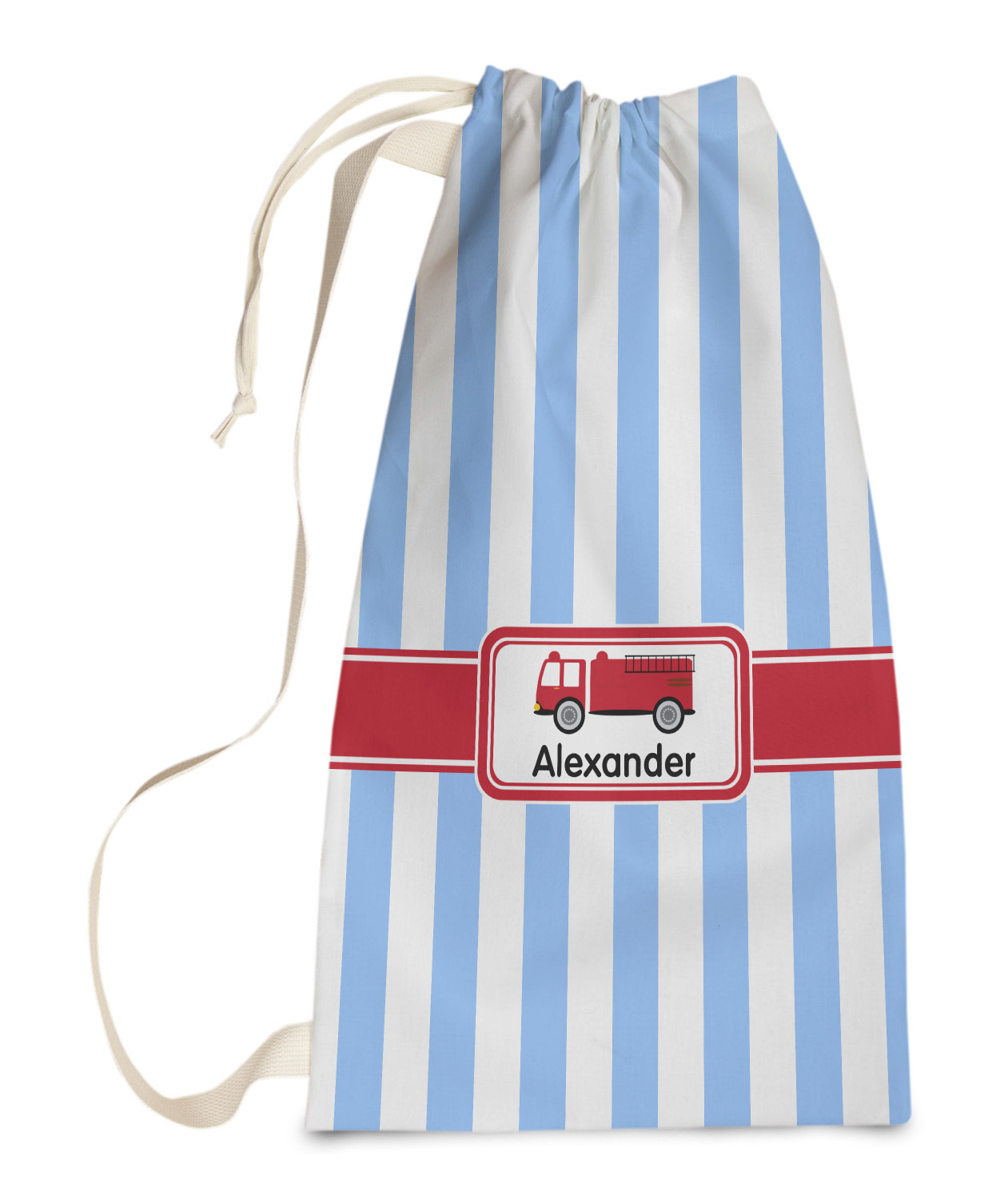 Carry your laundry in style with these customized laundry bags. Available in two sizes, featuring a natural colored woven strap and a cinch cord, these bags hold a lot of clothes or anything else you want to fit in them.