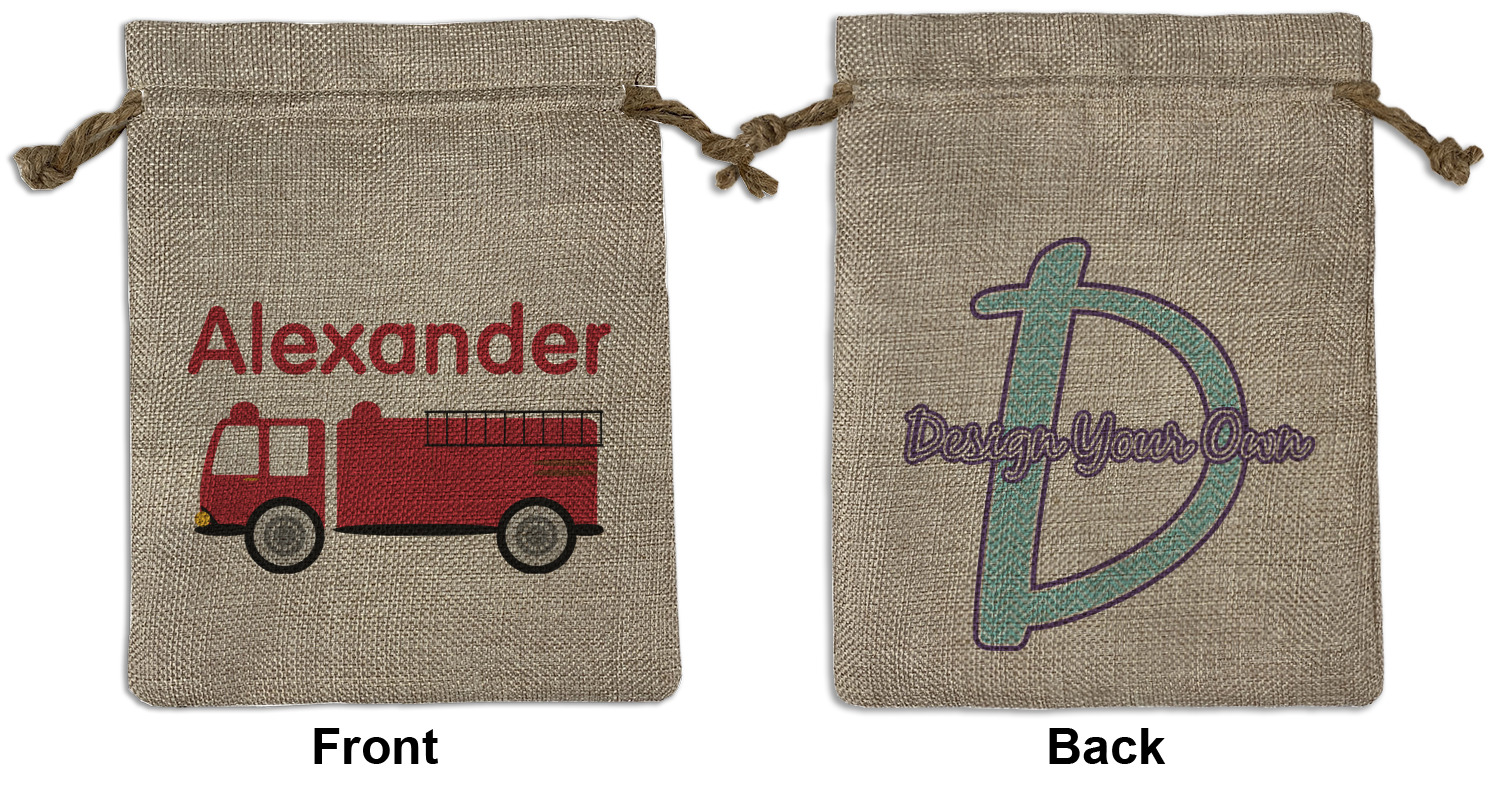 We sell our Burlap Gift Bags in 3 variant sized bags. Made with burlap polyester, each personalized bag can be secured with a twine drawstring pull. Your custom design is available to print on one side or both sides - completely up to you! The sizes of the bags measure approximately 4.5" x 6.5" for the smallest size, 6.5" x 8.0" for the medium size, and 6.5" x 13.5" for the large-sized bag.