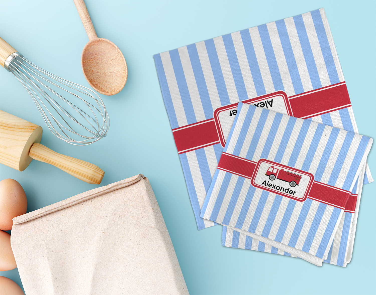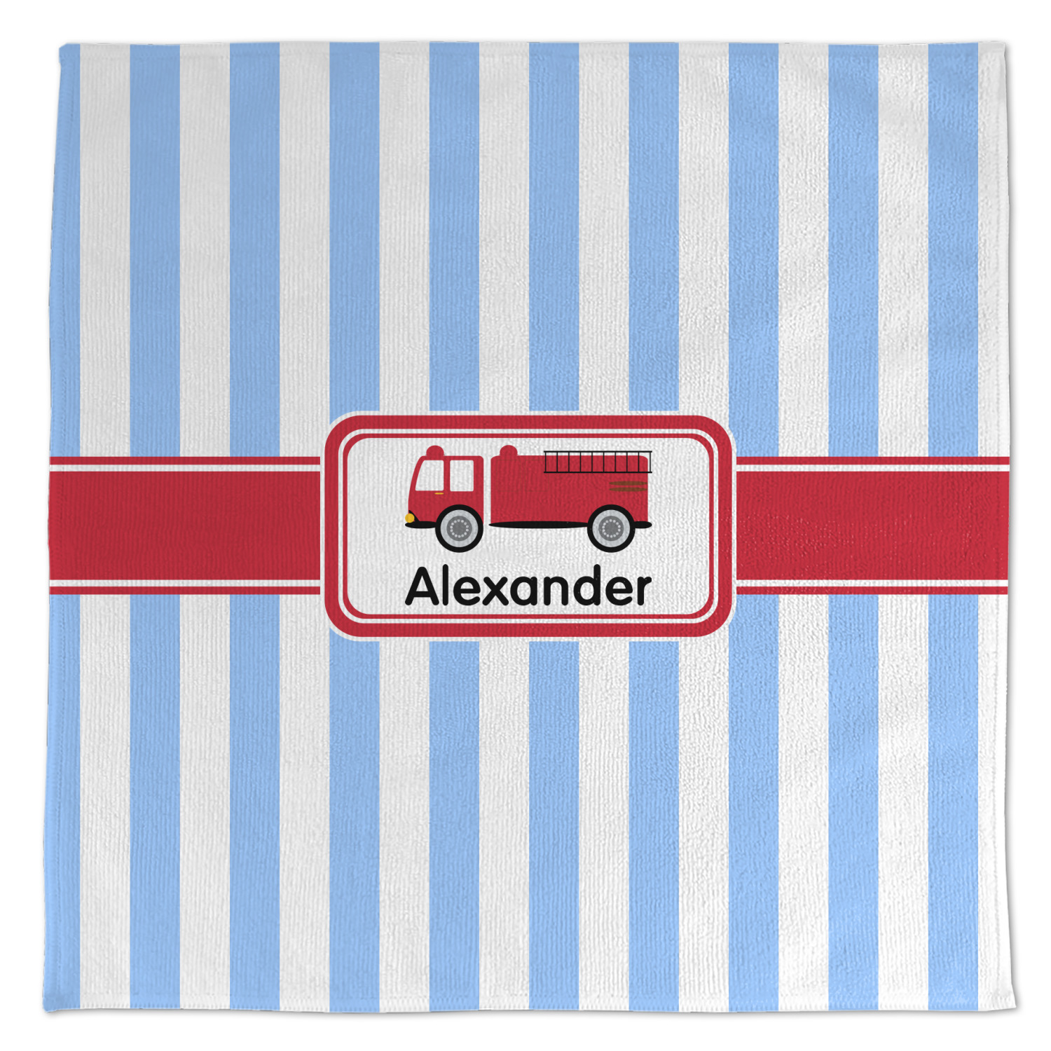 What little boy doesn't dream about growing up and becoming a fire fighter? Set on a classic striped blue and white background, this design featuring a snazzy firetruck is perfect for your little fireman-to-be.