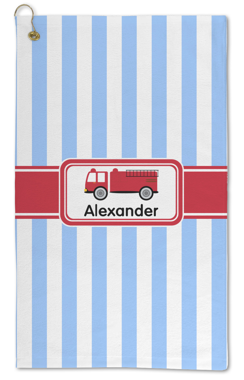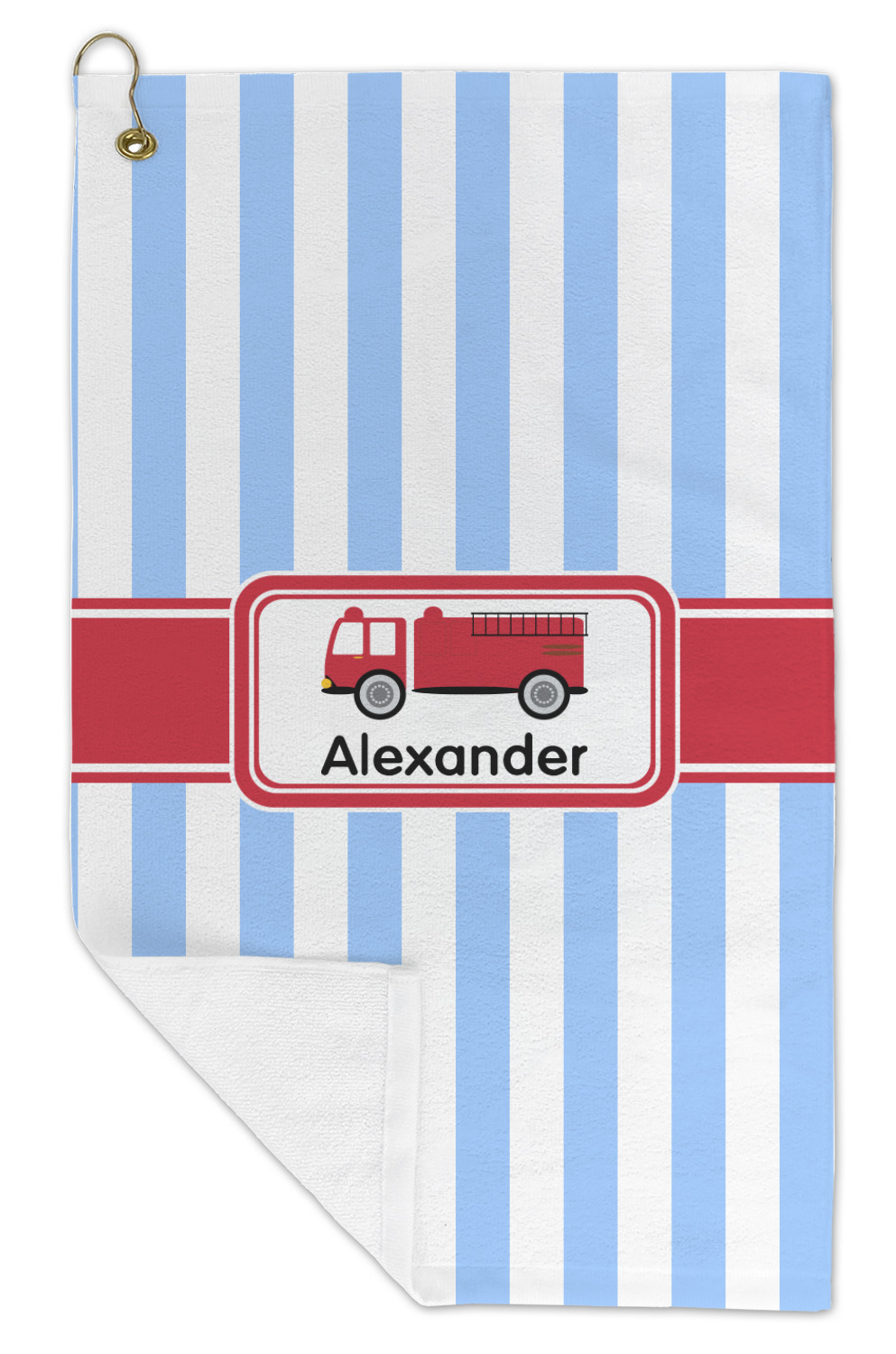 What little boy doesn't dream about growing up and becoming a fire fighter? Set on a classic striped blue and white background, this design featuring a snazzy firetruck is perfect for your little fireman-to-be.