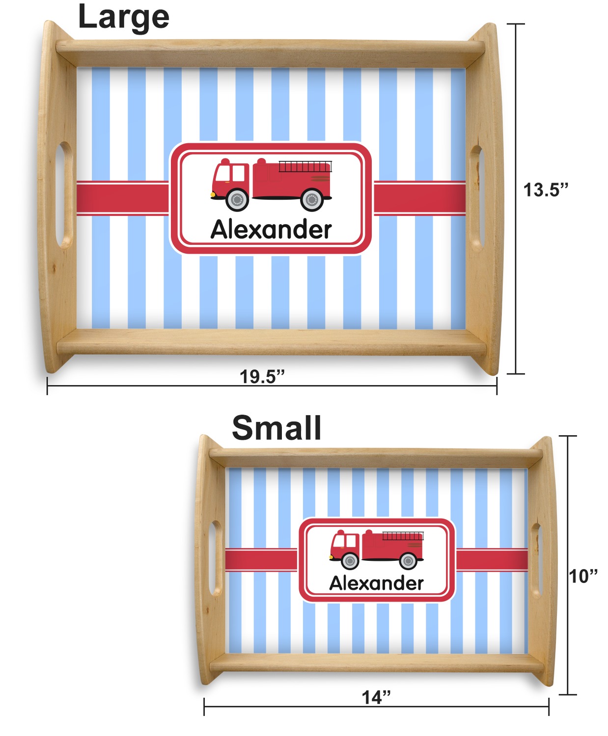 This serving tray with handles features square edges and two rounded sides, creating a very modern look. Each side is fabricated from a beautifully cut, natural wood. The bottom of the interior of the tray displays your customized design in bright, vibrant color. The tray is sold in both a black color and a natural wood look. Each variation of the wood serving tray has two sizes: Small, which is 14" x 10" x 2.25", and Large, which is 19.5" x 13.5" x 2.75".