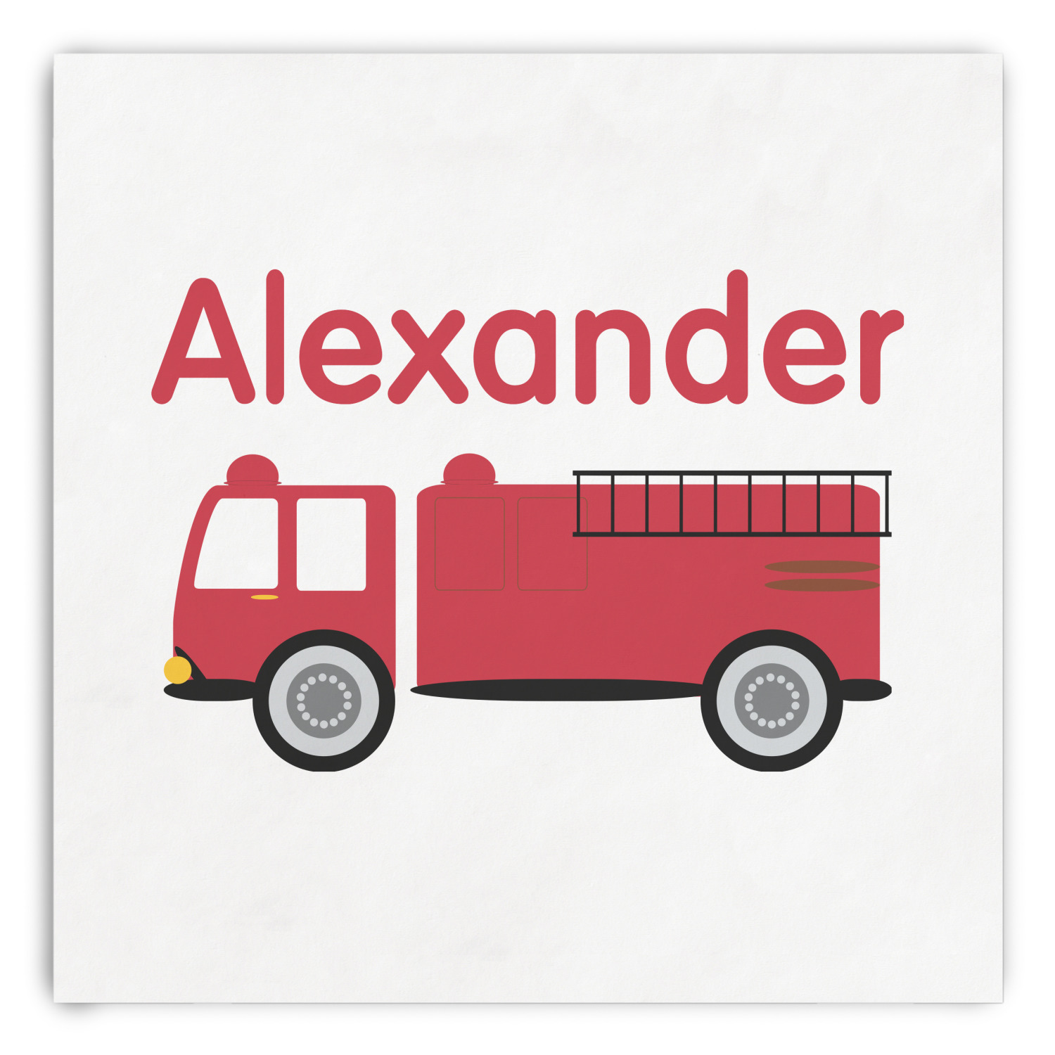 What little boy doesn't dream about growing up and becoming a fire fighter? Set on a classic striped blue and white background, this design featuring a snazzy firetruck is perfect for your little fireman-to-be.