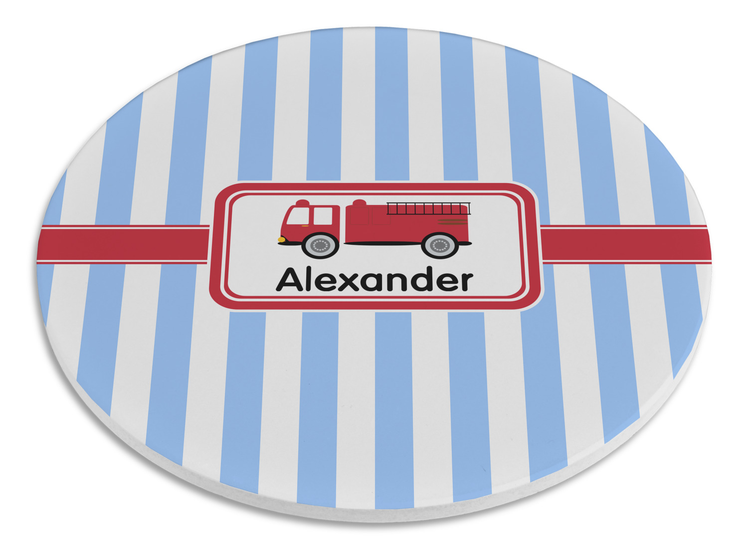 What little boy doesn't dream about growing up and becoming a fire fighter? Set on a classic striped blue and white background, this design featuring a snazzy firetruck is perfect for your little fireman-to-be.