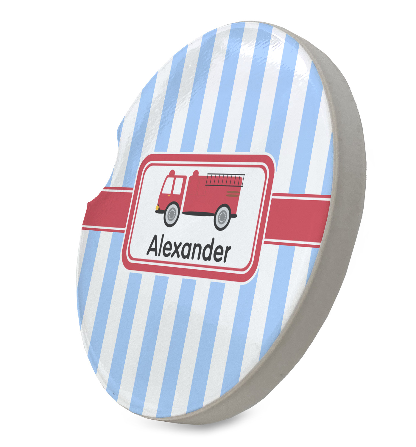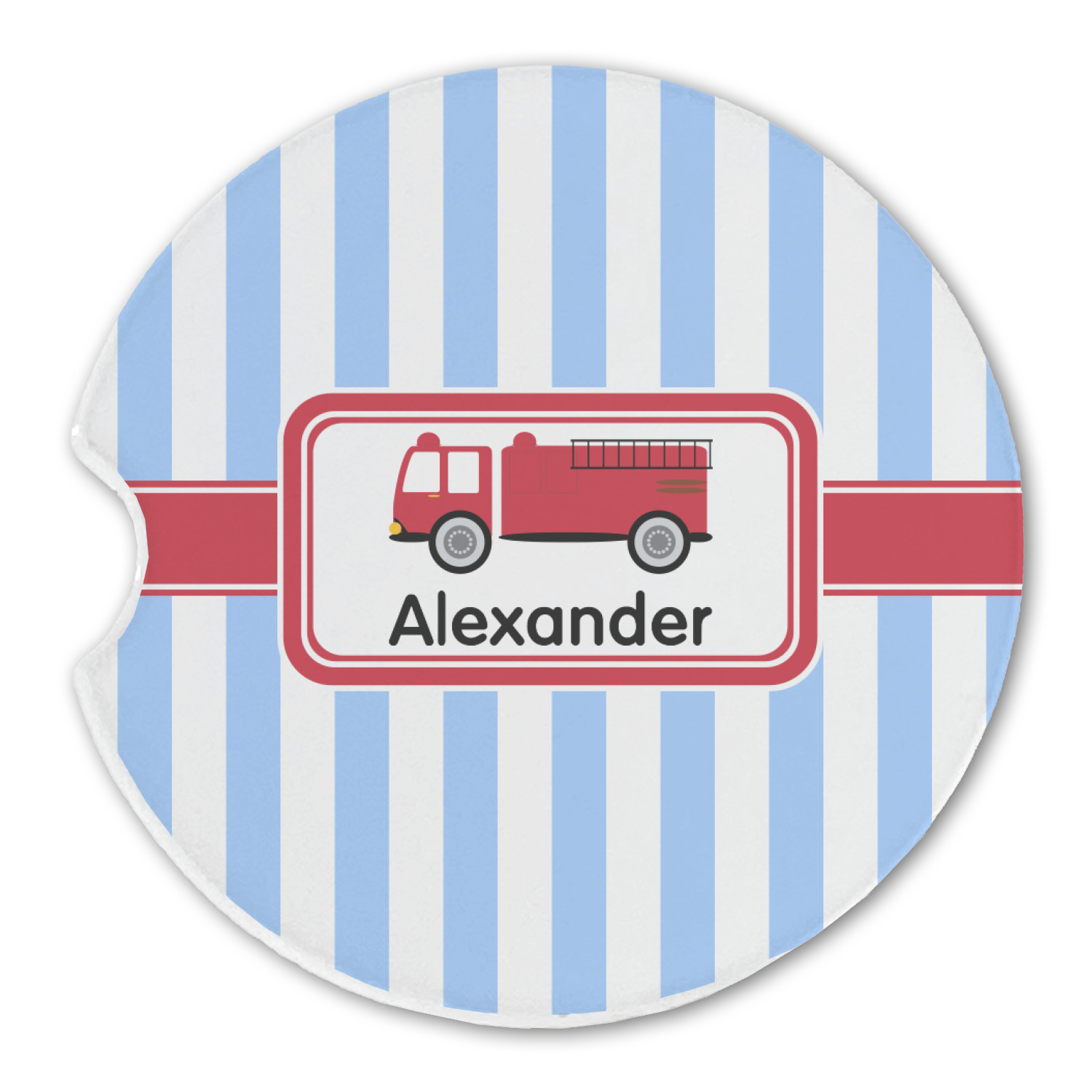What little boy doesn't dream about growing up and becoming a fire fighter? Set on a classic striped blue and white background, this design featuring a snazzy firetruck is perfect for your little fireman-to-be.