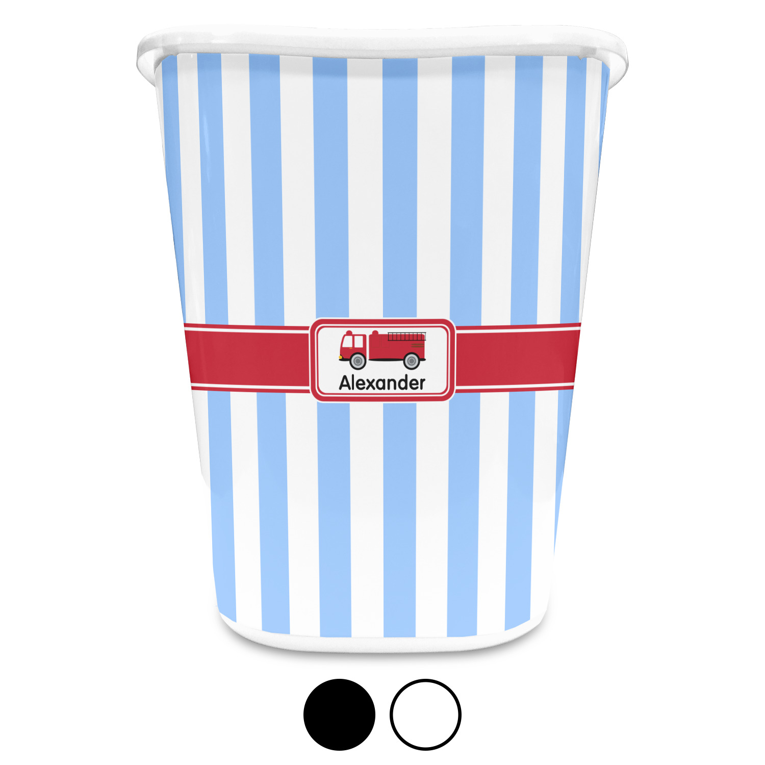 You can choose to purchase these decorative wastebaskets in either a white or a black color that will show on the base and the upper rim. Your customization is printed on a high-gloss, fine-quality vinyl adhesive, and you can choose to either have this adhesive applied to one side only or to both sides. As such, this plastic wastebasket can be single-sided or double-sided, depending on your creative vision. Your customization is printed using durable inks, making the design waterproof and resistant to fading over time.