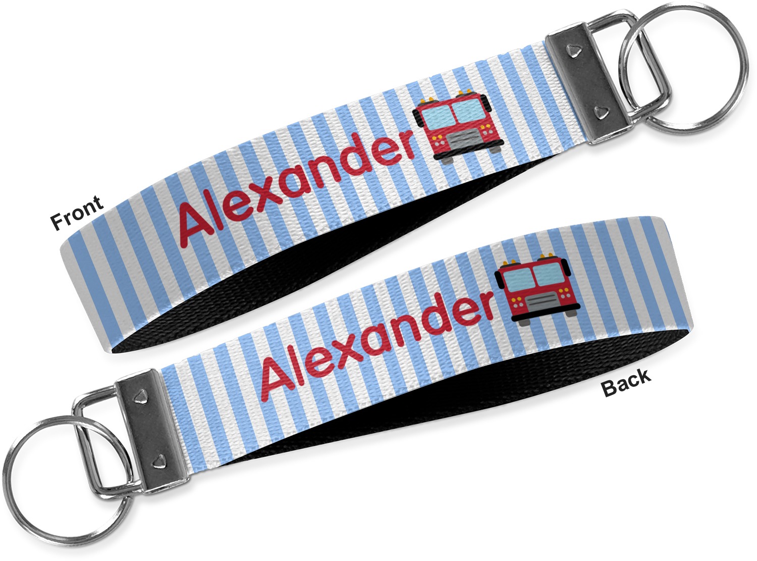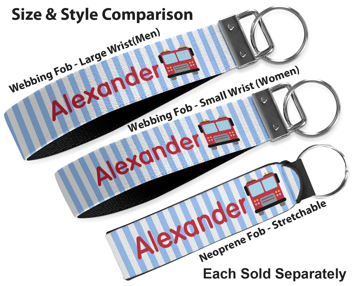 These key fob keychains are made from a polyester weave, right here in the USA. They feature a silver, metal clasp, attached to a round keyring. The piece gives the personalized wristlet a beautiful, finished look. Your customized design is printed on the outside of the keychain strap. We carry these wristlets in two sizes: small, which is 5 inches in width, and large, which is 5.5 inches in width.