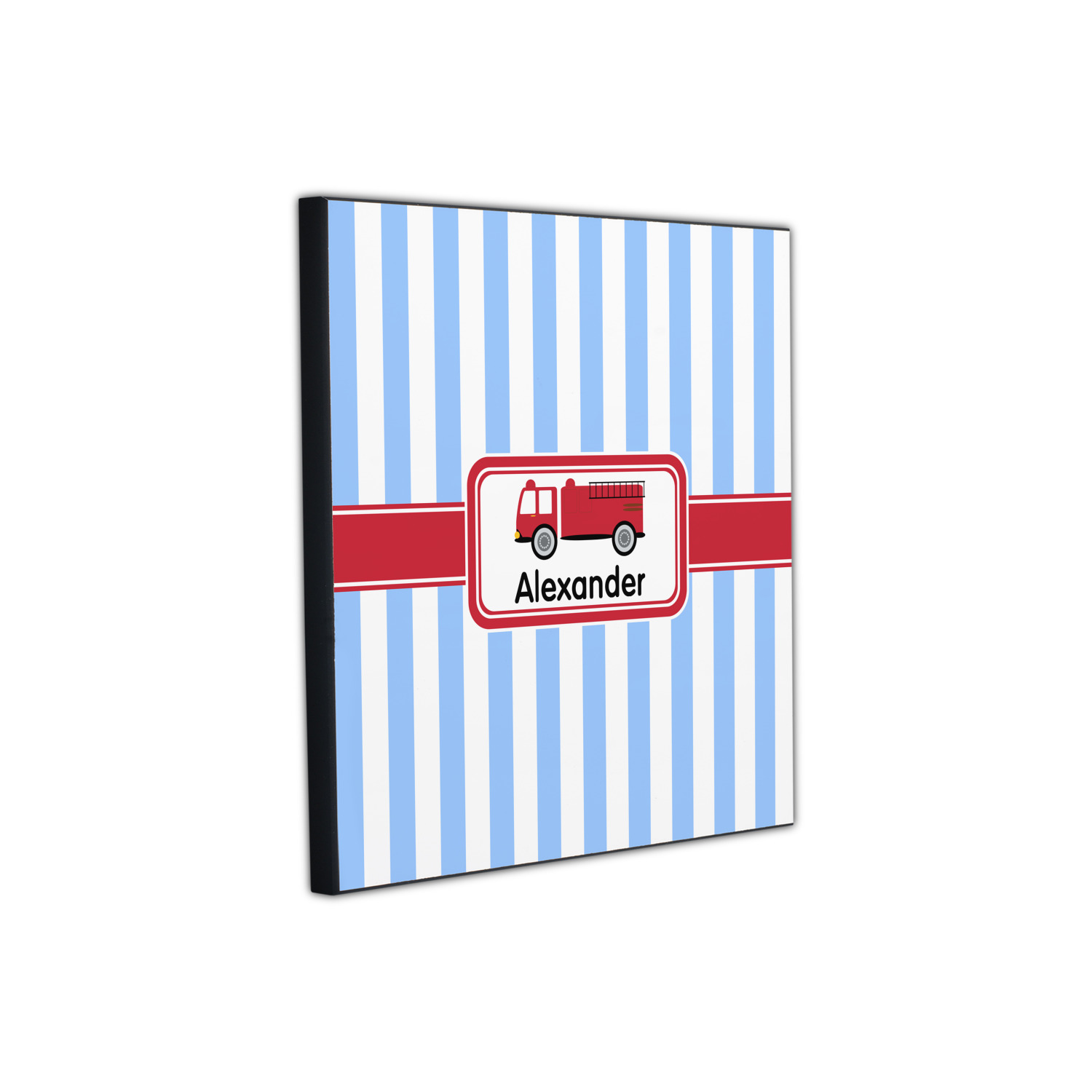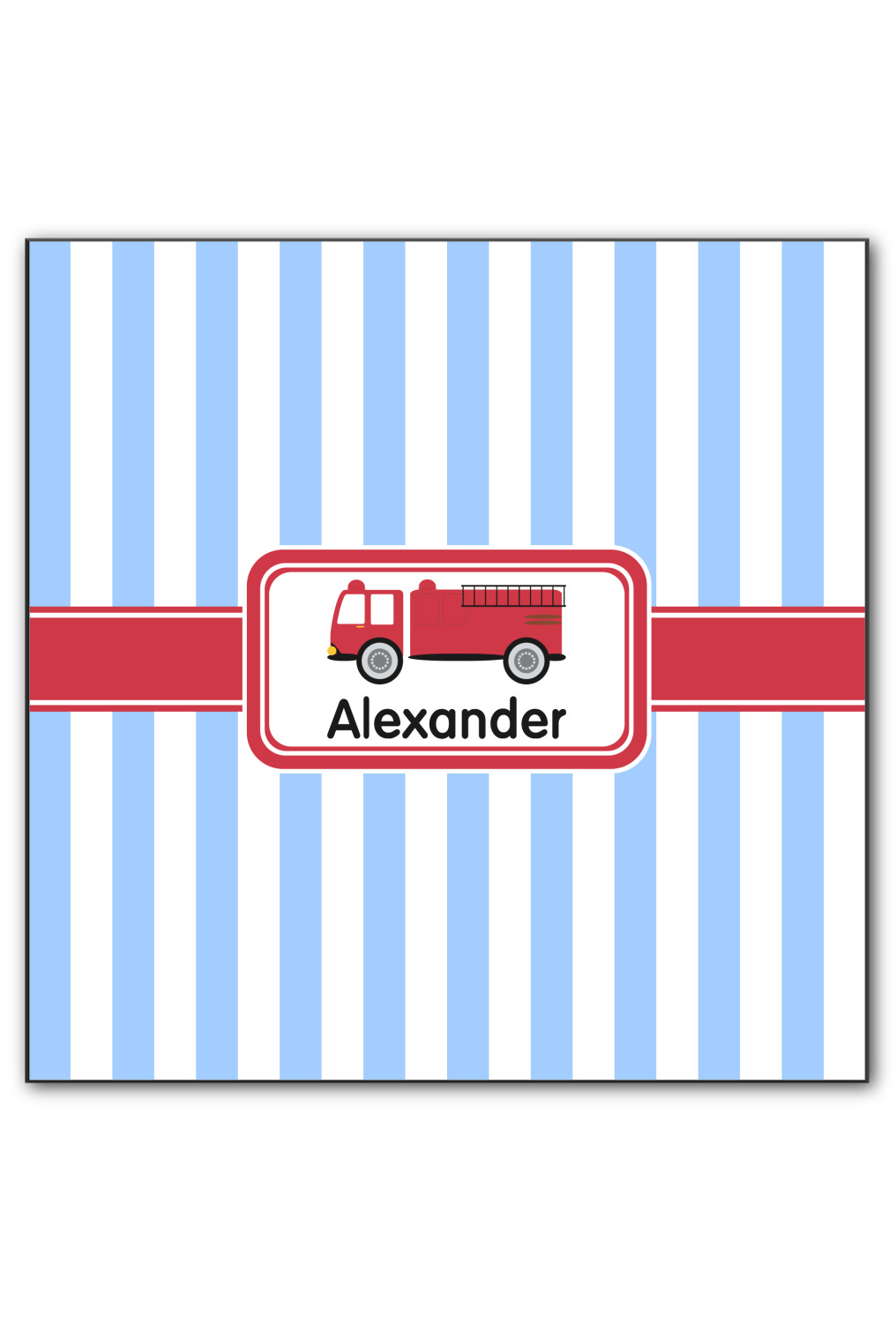 What little boy doesn't dream about growing up and becoming a fire fighter? Set on a classic striped blue and white background, this design featuring a snazzy firetruck is perfect for your little fireman-to-be.