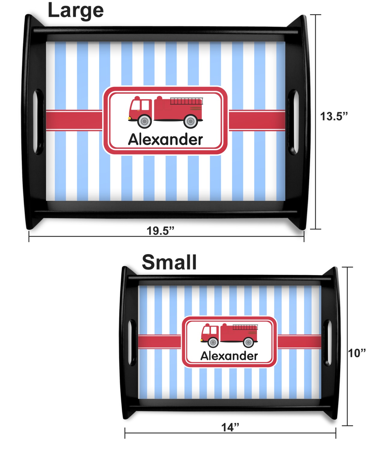 This serving tray with handles features square edges and two rounded sides, creating a very modern look. Each side is fabricated from a beautifully cut, natural wood. The bottom of the interior of the tray displays your customized design in bright, vibrant color. The tray is sold in both a black color and a natural wood look. Each variation of the wood serving tray has two sizes: Small, which is 14" x 10" x 2.25", and Large, which is 19.5" x 13.5" x 2.75".