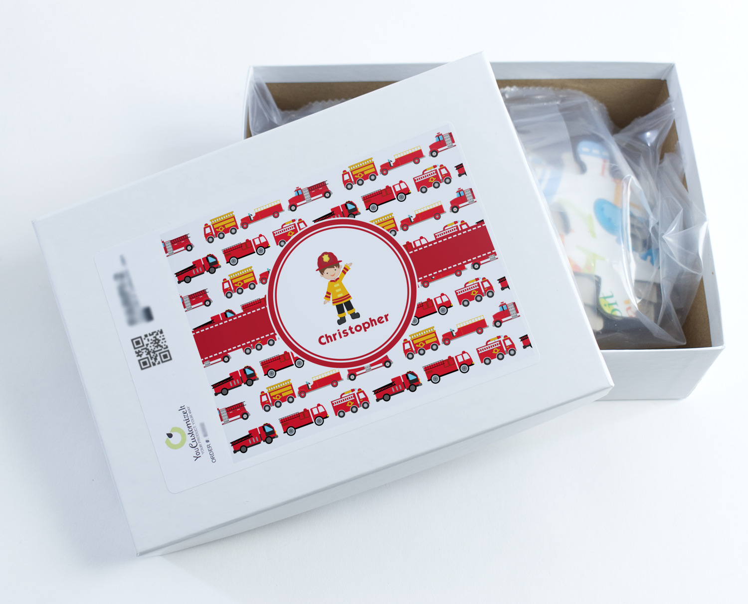 What little boy doesn't dream about growing up and becoming a fire fighter? Open his imagination with this adorable design showing your little man dressed to the nines and ready to save some lives, with a whole fleet of fire trucks behind him.