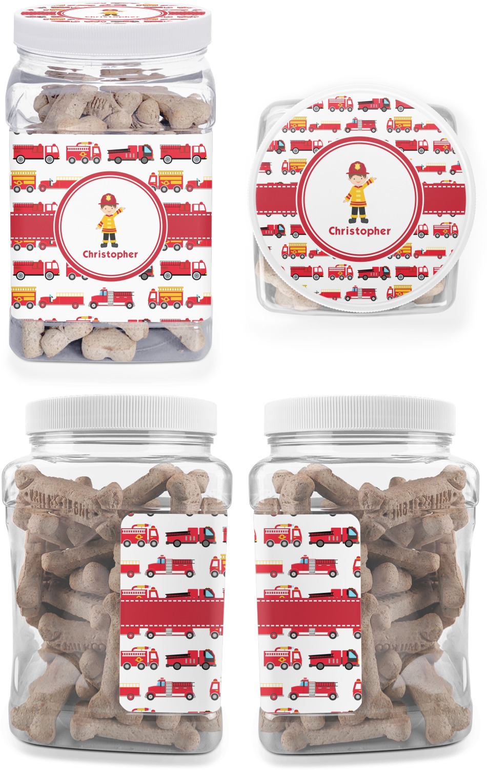 This half gallon jar, made from a sturdy plastic, is the perfect way to keep treats from any naughty pet paws, while still keeping them ready on hand for when your pup performs an impressive trick. This dog cookie jar features a screw-on, white lid that displays your personalized design on a vinyl sticker. We apply another customized sticker that wraps around the front and sides of the jar. Our dog treat jar also has indentations on the rear ends of the sides, which allows for convenient handling, and its square frame allows for easy storage.