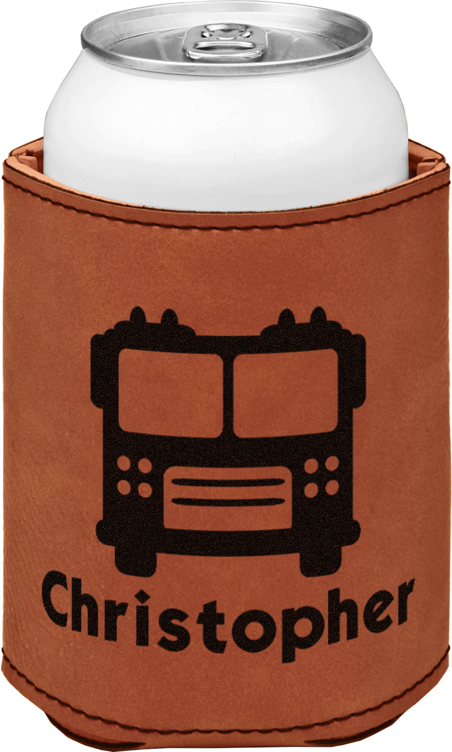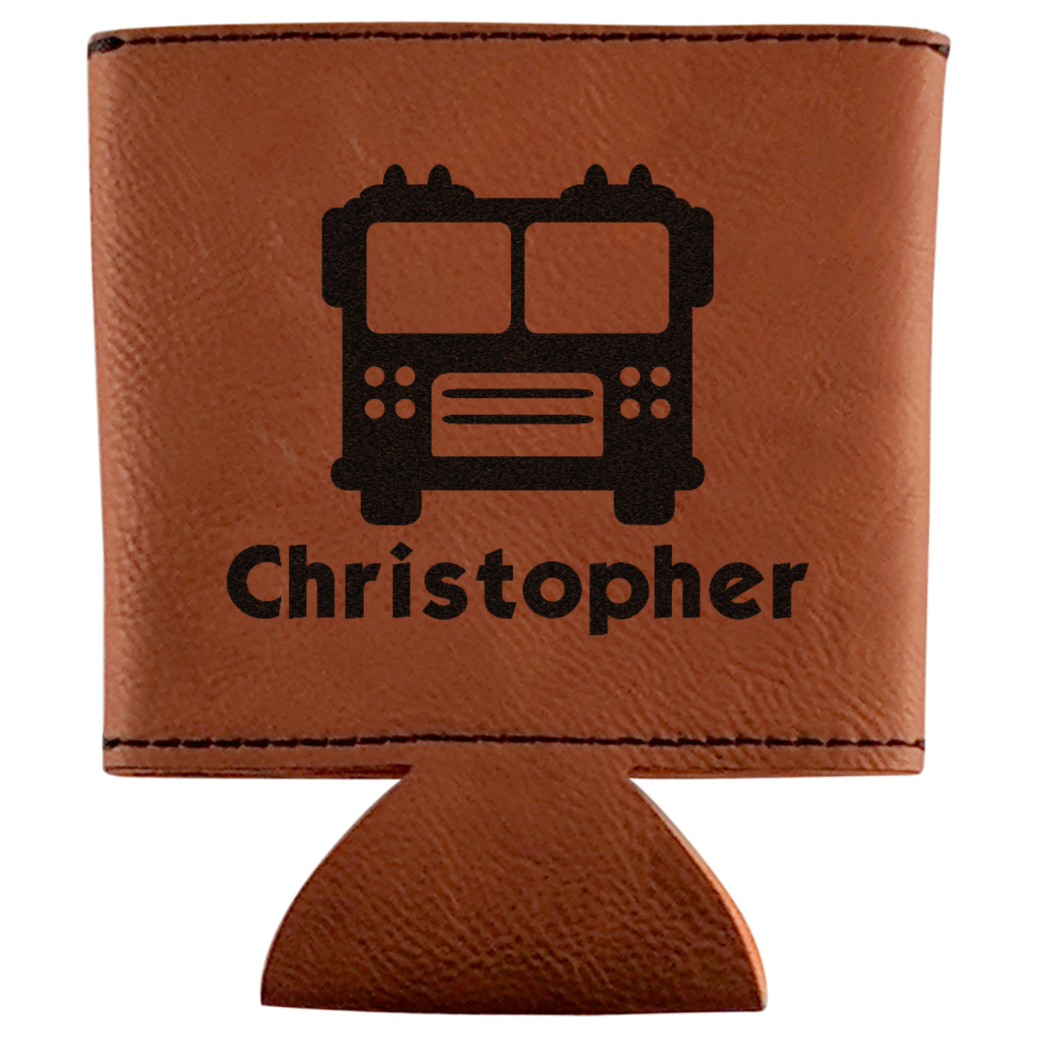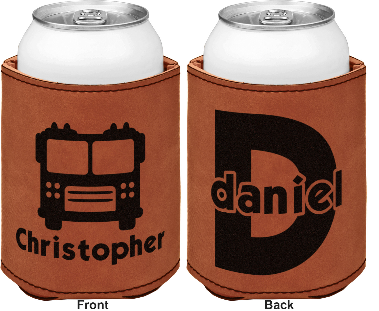 This can sleeve is made from a cognac-brown leatherette and stitched with a sturdy, black thread. A slim padding lines the inside of your can sleeve to allow for a better fit once your drink is inserted. The sleeve itself measures at 4 by 4.5 inches, allowing this custom can sleeve to accommodate most canned drinks. Your personalized design can be engraved on the front and back, or solely the front. When laser-engraved, your design appears as a black coloration which contrasts the leatherette nicely.