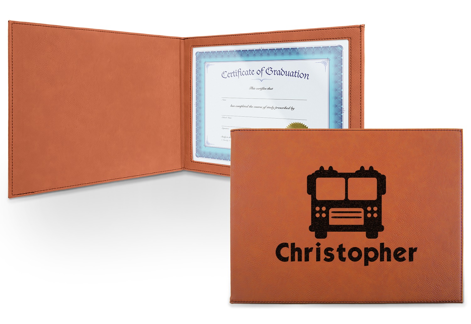 This cognac-colored, leatherette certificate jacket is the ideal way to display or store your hard-earned certificate. When closed, the custom certificate holder measures at 12 by 9 inches. The interior of the certificate cover includes a clear, vinyl window to encase your diploma. The window measures at around 10.5 by 7.5 inches and can accommodate a diploma that measures at up to 8.5 by 11 inches. You can either choose to have your customization laser engraved on the front and interior, or solely the front.
