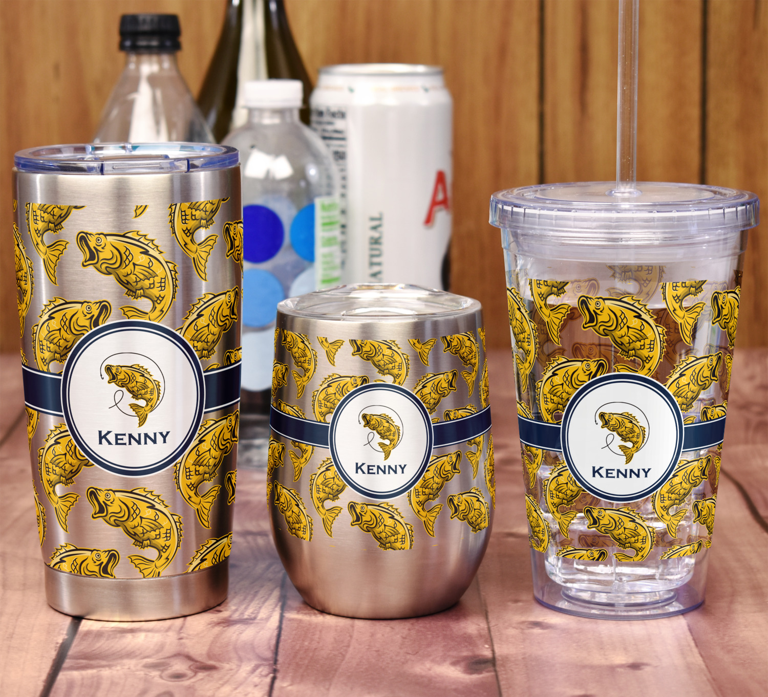 This Fish Design is perfect for all the fishermen in your life. The design is shown with yellow fish on a navy blue background. However, both the background and fish colors can be changed Through the center of the design, there is ribbon with a label. The label contains a fish and hook graphic, but this graphic can be changed to a different fish or other graphic. Just like the fish and background, the ribbon and label color can be customized.