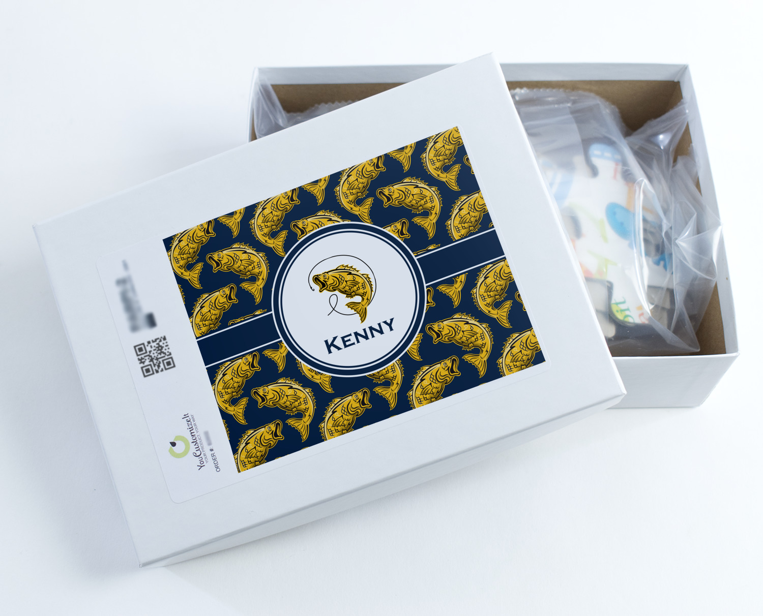 This Fish Design is perfect for all the fishermen in your life. The design is shown with yellow fish on a navy blue background. However, both the background and fish colors can be changed Through the center of the design, there is ribbon with a label. The label contains a fish and hook graphic, but this graphic can be changed to a different fish or other graphic. Just like the fish and background, the ribbon and label color can be customized.