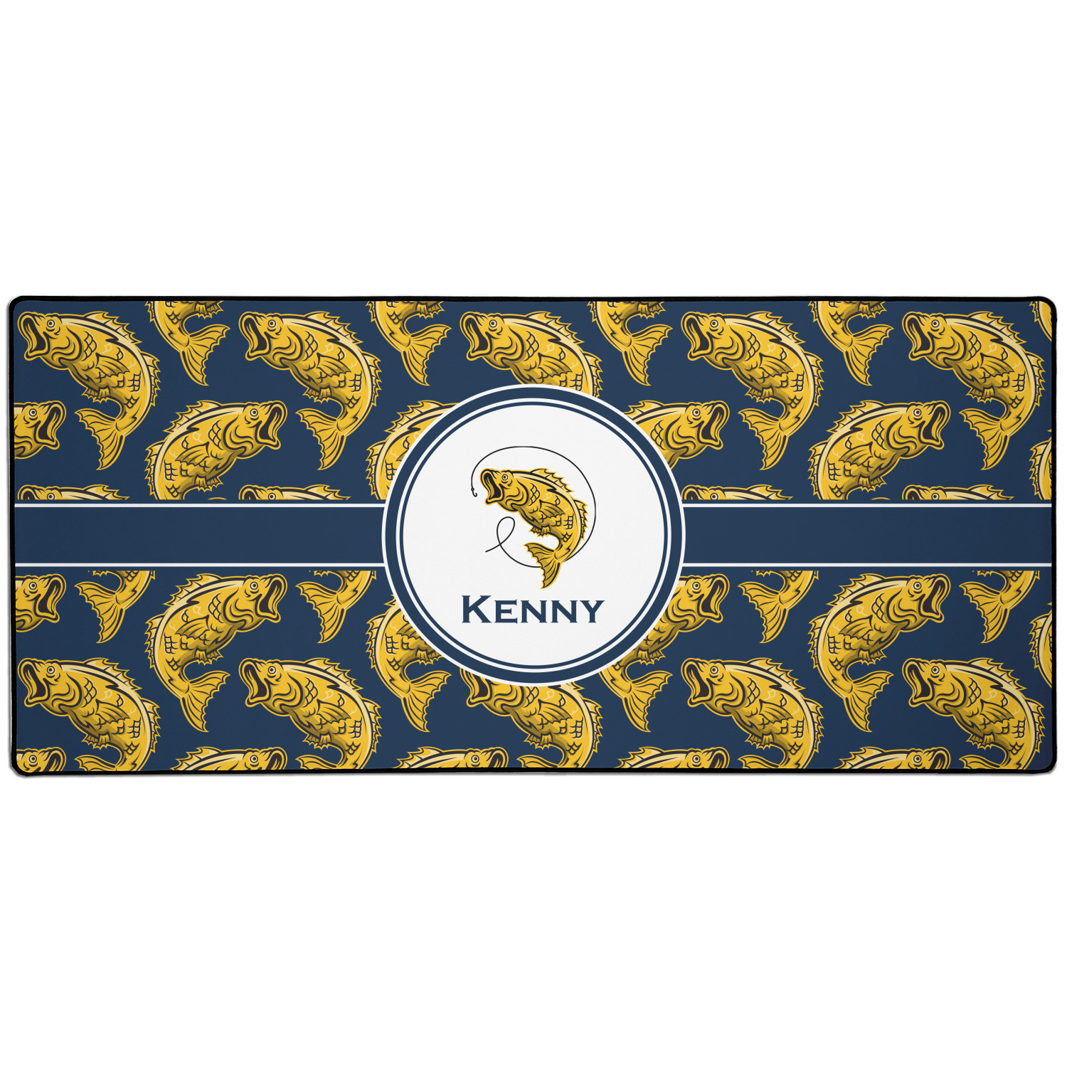 This Fish Design is perfect for all the fishermen in your life. The design is shown with yellow fish on a navy blue background. However, both the background and fish colors can be changed Through the center of the design, there is ribbon with a label. The label contains a fish and hook graphic, but this graphic can be changed to a different fish or other graphic. Just like the fish and background, the ribbon and label color can be customized.