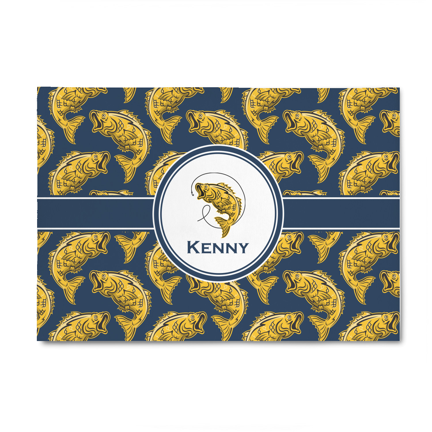 This Fish Design is perfect for all the fishermen in your life. The design is shown with yellow fish on a navy blue background. However, both the background and fish colors can be changed Through the center of the design, there is ribbon with a label. The label contains a fish and hook graphic, but this graphic can be changed to a different fish or other graphic. Just like the fish and background, the ribbon and label color can be customized.