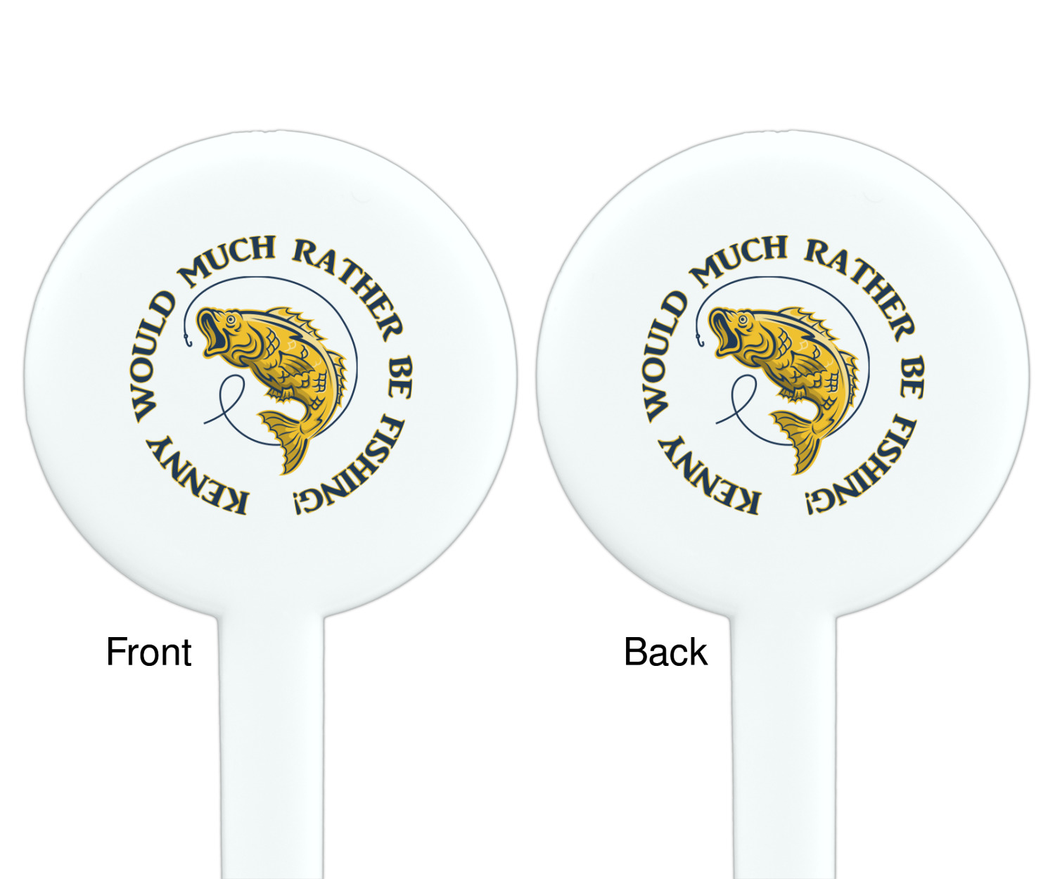 This Fish Design is perfect for all the fishermen in your life. The design is shown with yellow fish on a navy blue background. However, both the background and fish colors can be changed Through the center of the design, there is ribbon with a label. The label contains a fish and hook graphic, but this graphic can be changed to a different fish or other graphic. Just like the fish and background, the ribbon and label color can be customized.