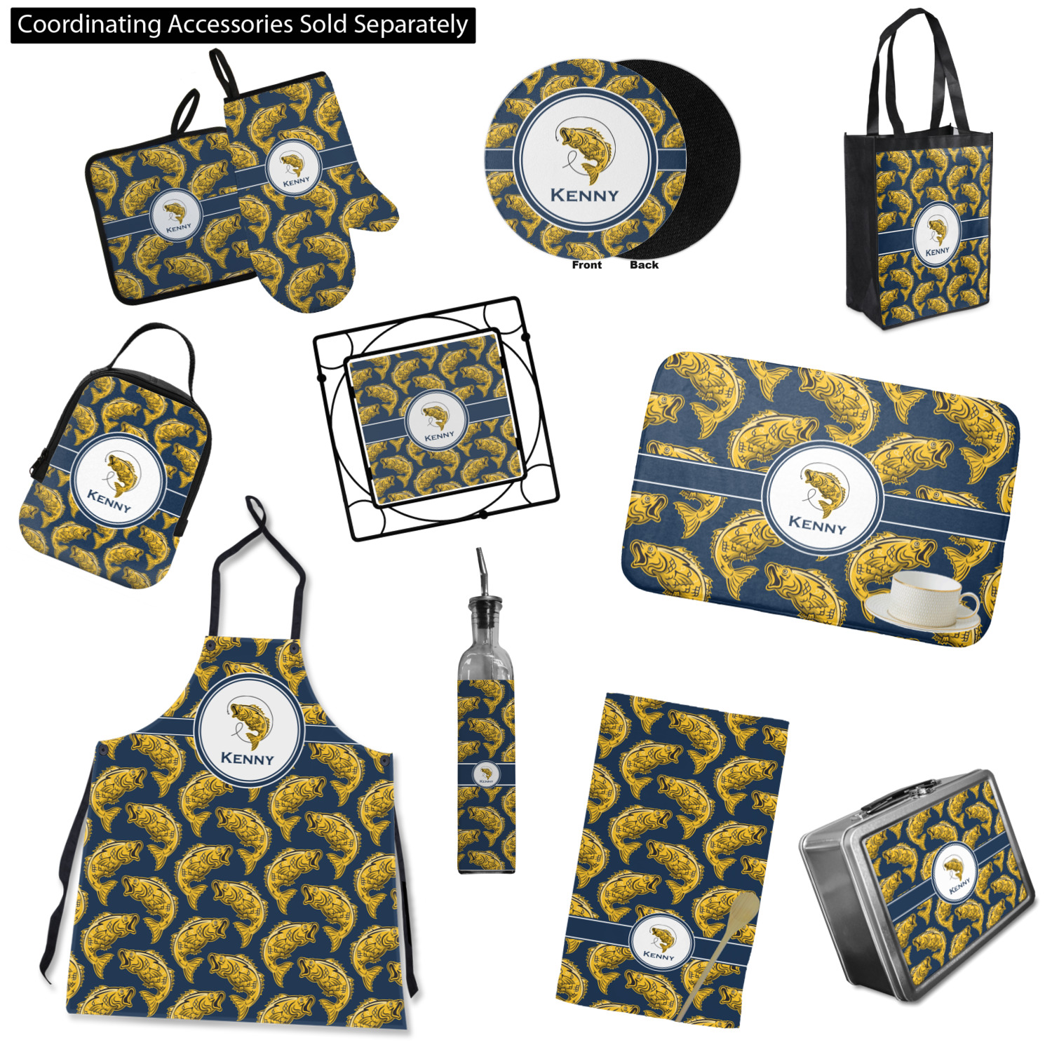This Fish Design is perfect for all the fishermen in your life. The design is shown with yellow fish on a navy blue background. However, both the background and fish colors can be changed Through the center of the design, there is ribbon with a label. The label contains a fish and hook graphic, but this graphic can be changed to a different fish or other graphic. Just like the fish and background, the ribbon and label color can be customized.