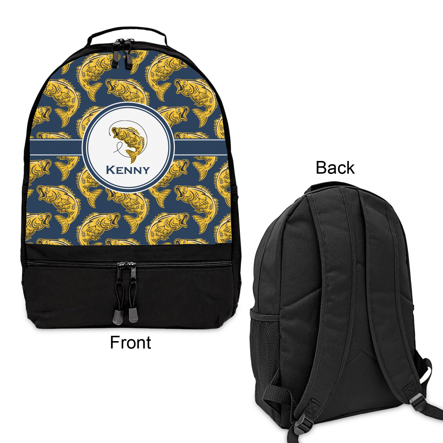 This Fish Design is perfect for all the fishermen in your life. The design is shown with yellow fish on a navy blue background. However, both the background and fish colors can be changed Through the center of the design, there is ribbon with a label. The label contains a fish and hook graphic, but this graphic can be changed to a different fish or other graphic. Just like the fish and background, the ribbon and label color can be customized.
