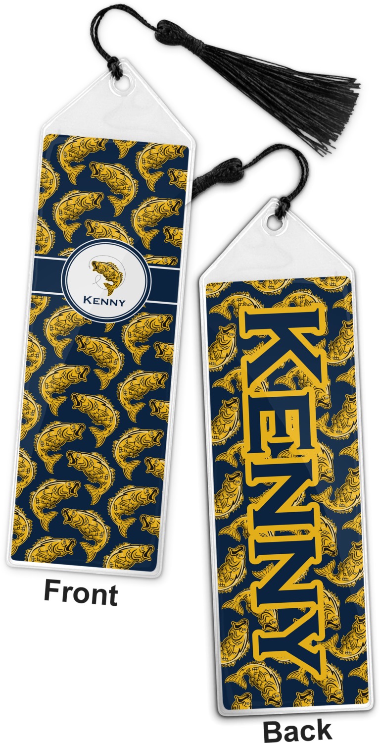 Your personalized bookmark is made of a sturdy, clear vinyl, and is approximately 7.5" x 2.25". We display your personalization on vinyl inserts that are placed on both sides. Accompanying each book marker is a black, fringe tassel that attaches to the reinforced, triangular header.