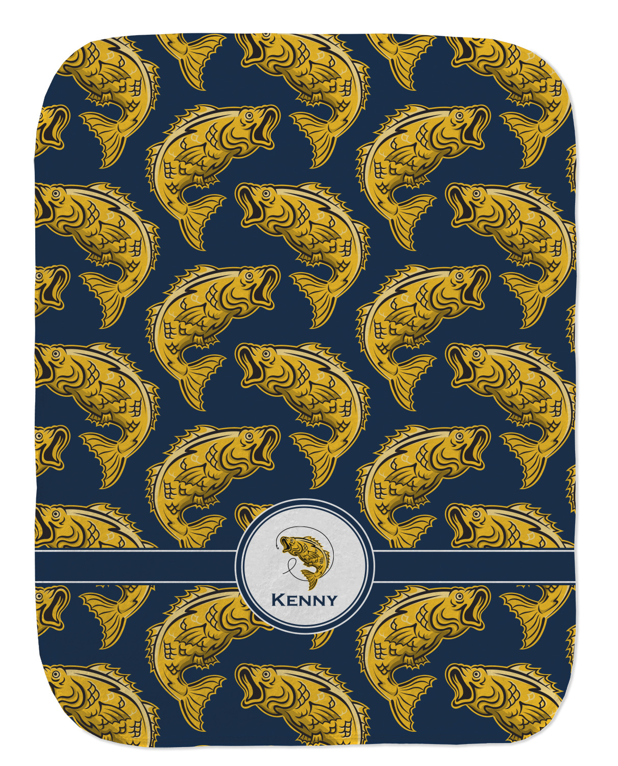 This Fish Design is perfect for all the fishermen in your life. The design is shown with yellow fish on a navy blue background. However, both the background and fish colors can be changed Through the center of the design, there is ribbon with a label. The label contains a fish and hook graphic, but this graphic can be changed to a different fish or other graphic. Just like the fish and background, the ribbon and label color can be customized.