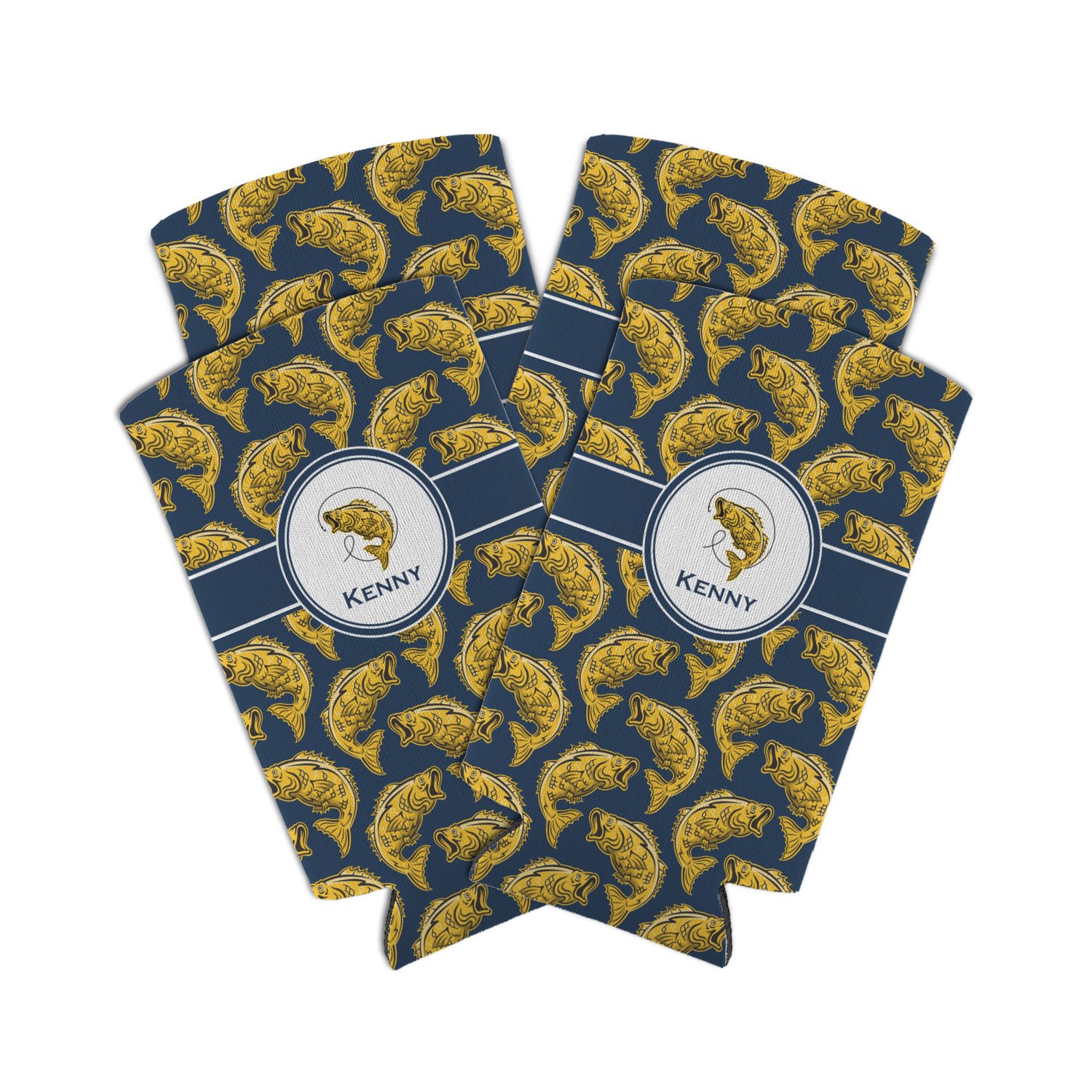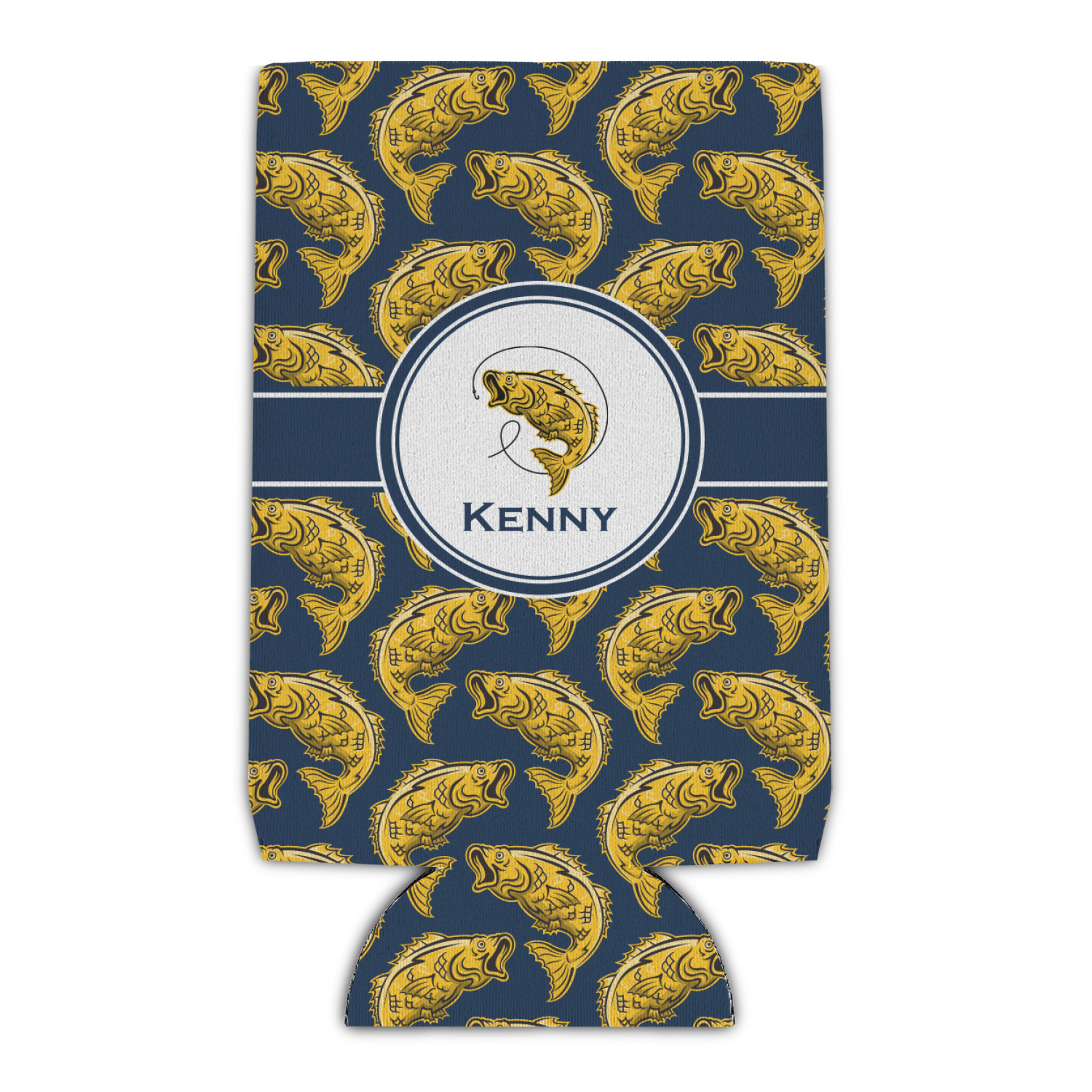 This Fish Design is perfect for all the fishermen in your life. The design is shown with yellow fish on a navy blue background. However, both the background and fish colors can be changed Through the center of the design, there is ribbon with a label. The label contains a fish and hook graphic, but this graphic can be changed to a different fish or other graphic. Just like the fish and background, the ribbon and label color can be customized.