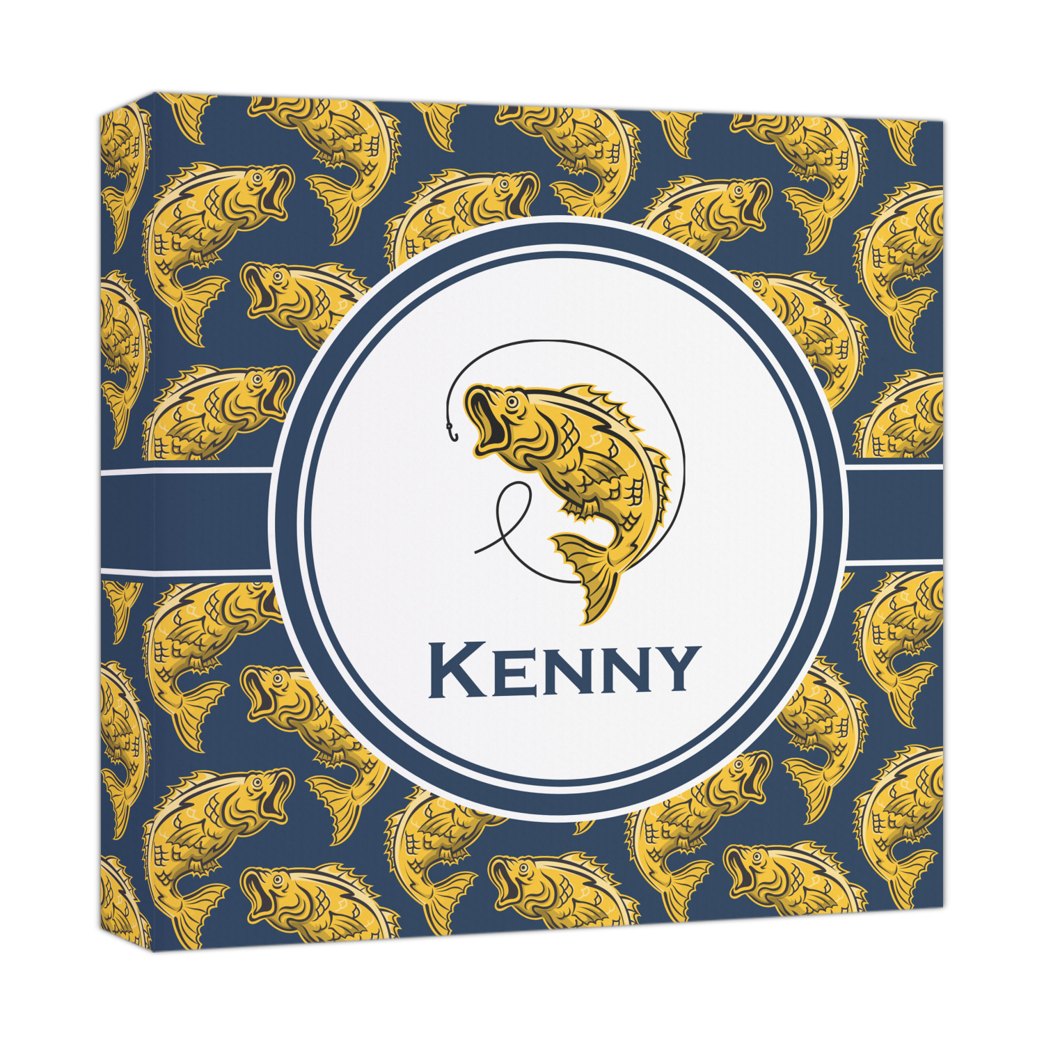 This Fish Design is perfect for all the fishermen in your life. The design is shown with yellow fish on a navy blue background. However, both the background and fish colors can be changed Through the center of the design, there is ribbon with a label. The label contains a fish and hook graphic, but this graphic can be changed to a different fish or other graphic. Just like the fish and background, the ribbon and label color can be customized.