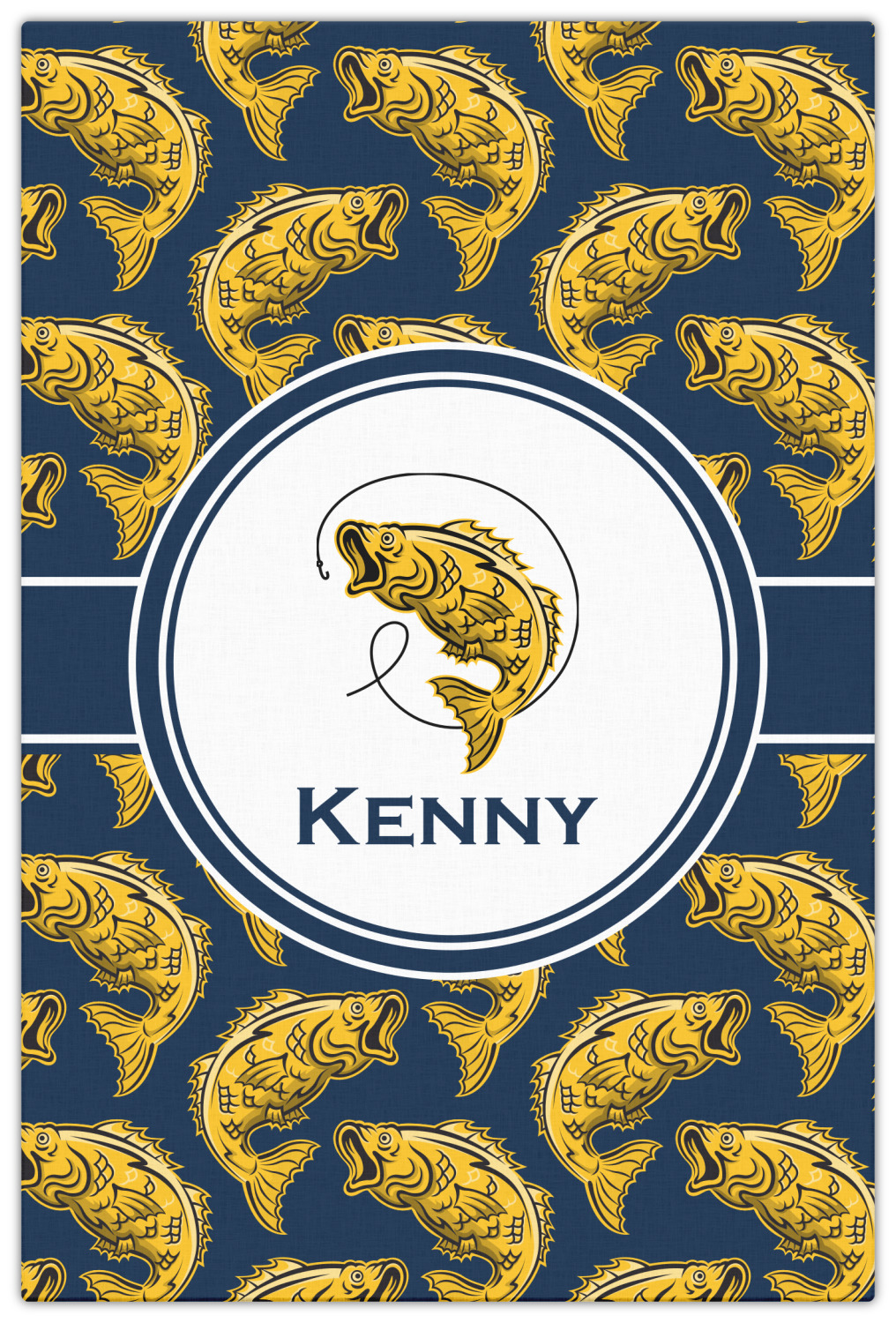 This Fish Design is perfect for all the fishermen in your life. The design is shown with yellow fish on a navy blue background. However, both the background and fish colors can be changed Through the center of the design, there is ribbon with a label. The label contains a fish and hook graphic, but this graphic can be changed to a different fish or other graphic. Just like the fish and background, the ribbon and label color can be customized.