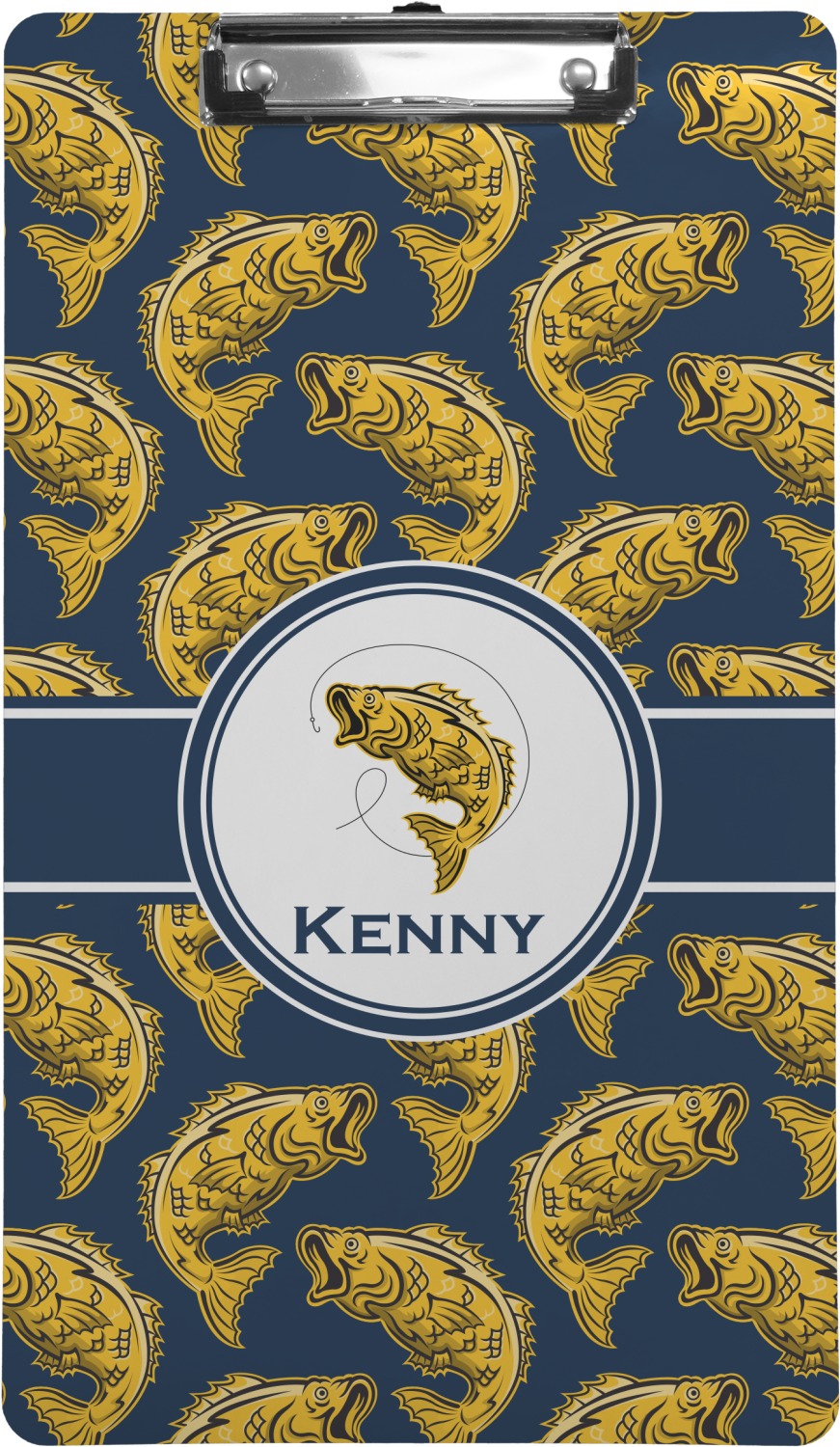 This Fish Design is perfect for all the fishermen in your life. The design is shown with yellow fish on a navy blue background. However, both the background and fish colors can be changed Through the center of the design, there is ribbon with a label. The label contains a fish and hook graphic, but this graphic can be changed to a different fish or other graphic. Just like the fish and background, the ribbon and label color can be customized.