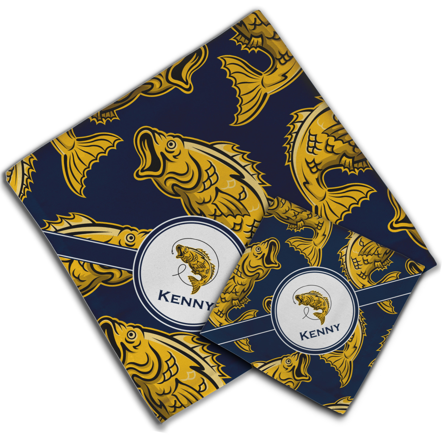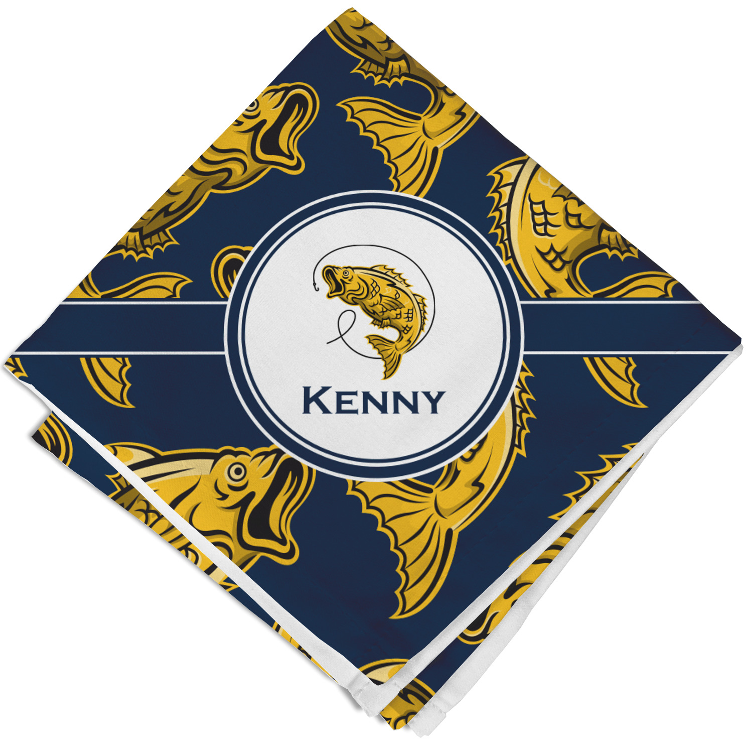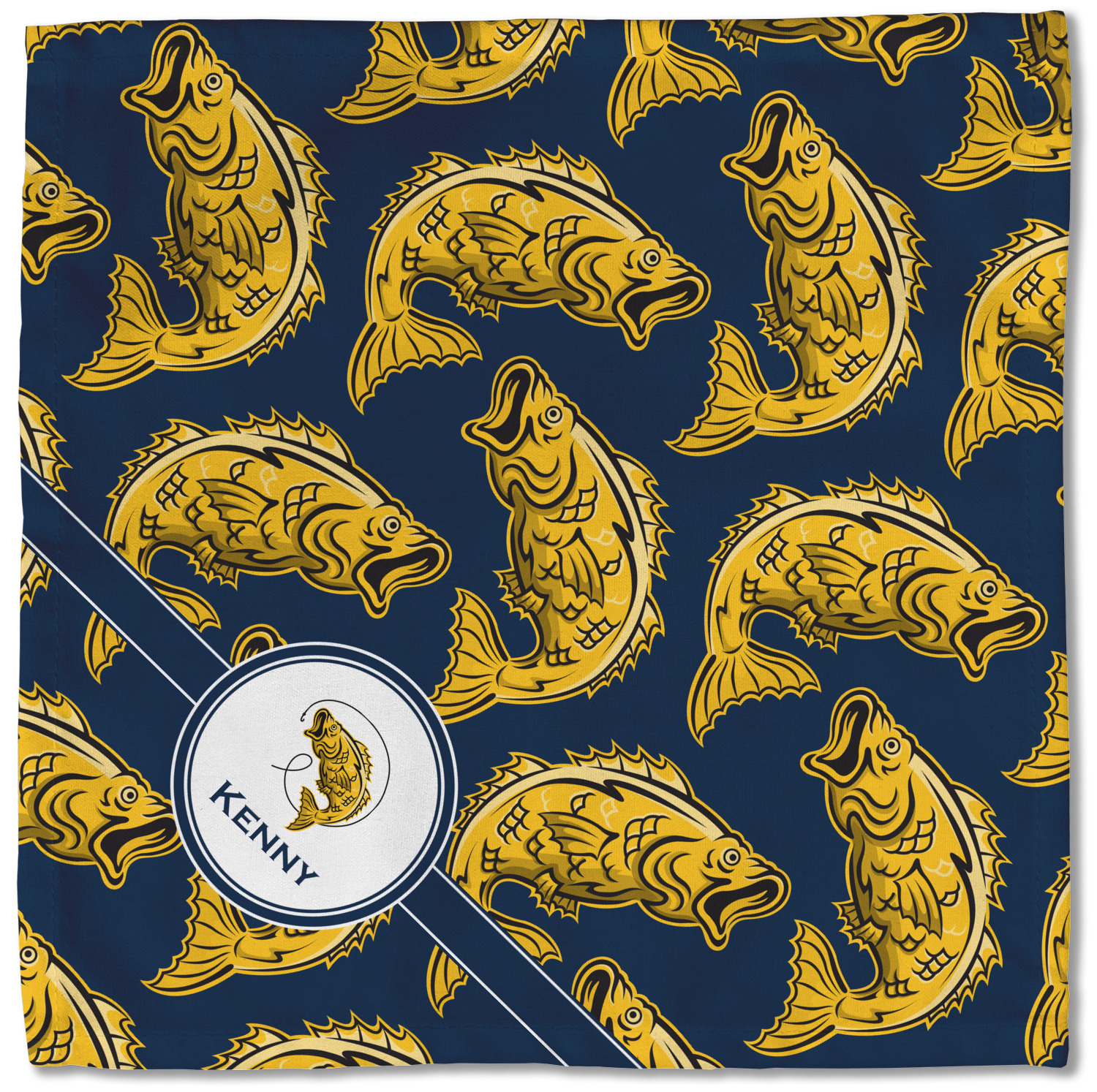 This Fish Design is perfect for all the fishermen in your life. The design is shown with yellow fish on a navy blue background. However, both the background and fish colors can be changed Through the center of the design, there is ribbon with a label. The label contains a fish and hook graphic, but this graphic can be changed to a different fish or other graphic. Just like the fish and background, the ribbon and label color can be customized.