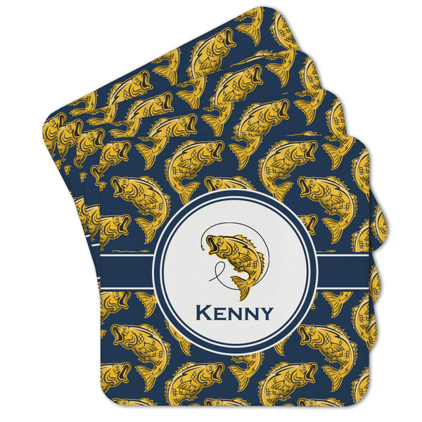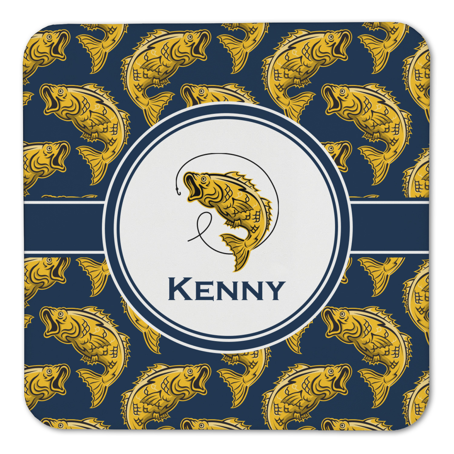 This Fish Design is perfect for all the fishermen in your life. The design is shown with yellow fish on a navy blue background. However, both the background and fish colors can be changed Through the center of the design, there is ribbon with a label. The label contains a fish and hook graphic, but this graphic can be changed to a different fish or other graphic. Just like the fish and background, the ribbon and label color can be customized.