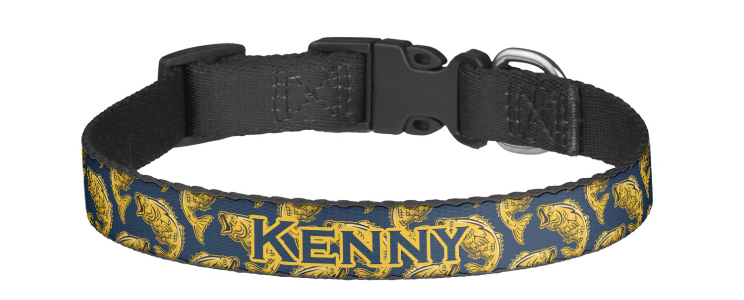 This sturdy collar, made from a durable nylon weave, will outlive your dog's episodes of excited tugging and pulling. Courtesy of its thick plastic buckle and adjuster, this collar is adjustable and accommodating of any dog. Structurally, the collar is a single piece of nylon weave that is sewn together, and features a solid metal loop where you can attach a leash or dog tag. We print and display your dog's name and pattern across the middle of the personalized dog collar.