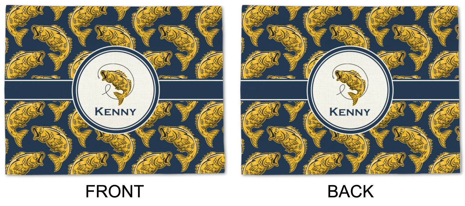 This Fish Design is perfect for all the fishermen in your life. The design is shown with yellow fish on a navy blue background. However, both the background and fish colors can be changed Through the center of the design, there is ribbon with a label. The label contains a fish and hook graphic, but this graphic can be changed to a different fish or other graphic. Just like the fish and background, the ribbon and label color can be customized.
