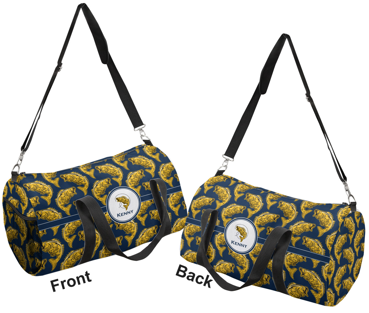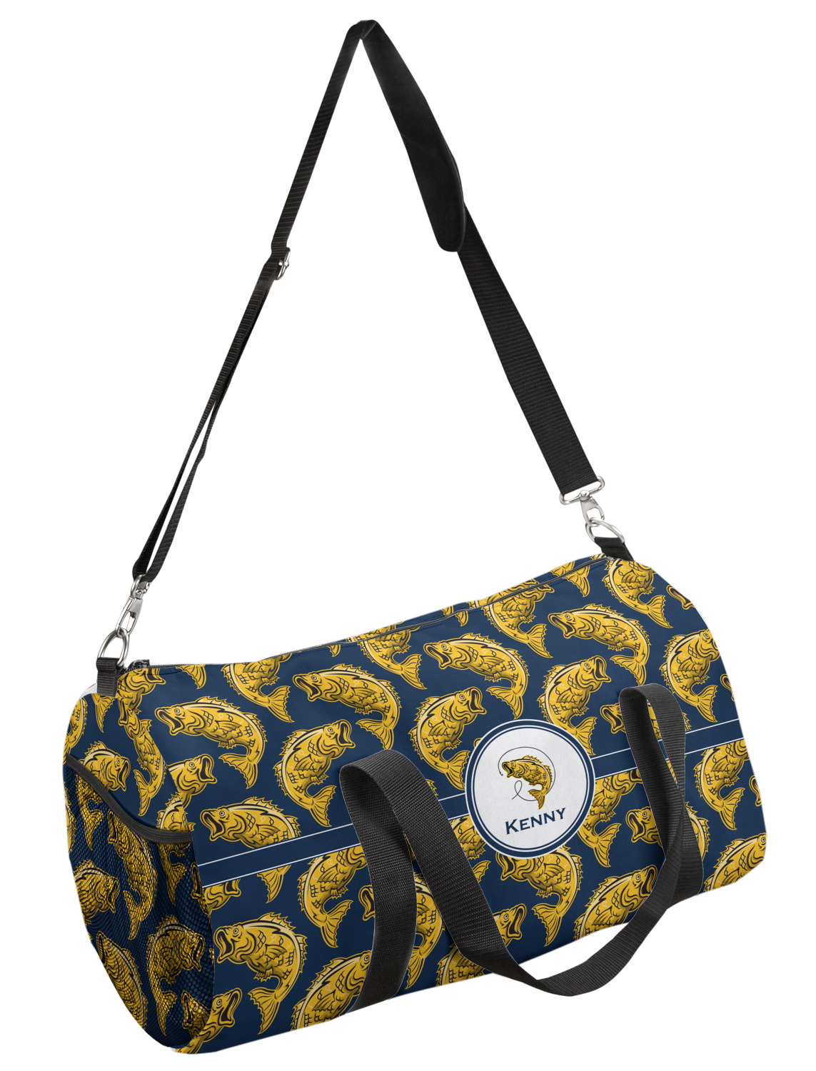 This duffle is a sturdy bag made of a canvas material. It comes in two sizes: Small (19"W x 9.5"H x 9.5"D) and Large (23"W x 12"H x 12"D). The bag is a cylindrical shape with a black adjustable strap and two handles. On one side is an elastic pouch to put a waterbottle or other small item. Your product will be sublimated with your design and is able to be designed on the front, back, and sides. Be sure to remember that the straps may cut into parts of your design if you upload your own artwork.