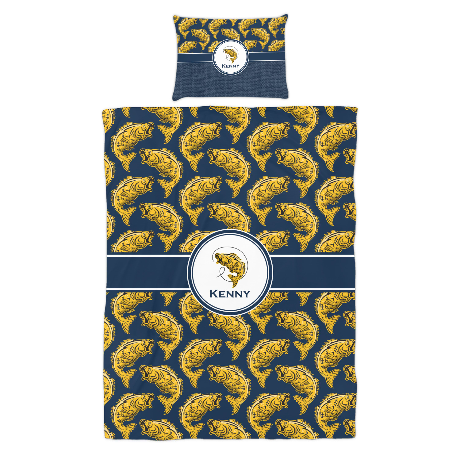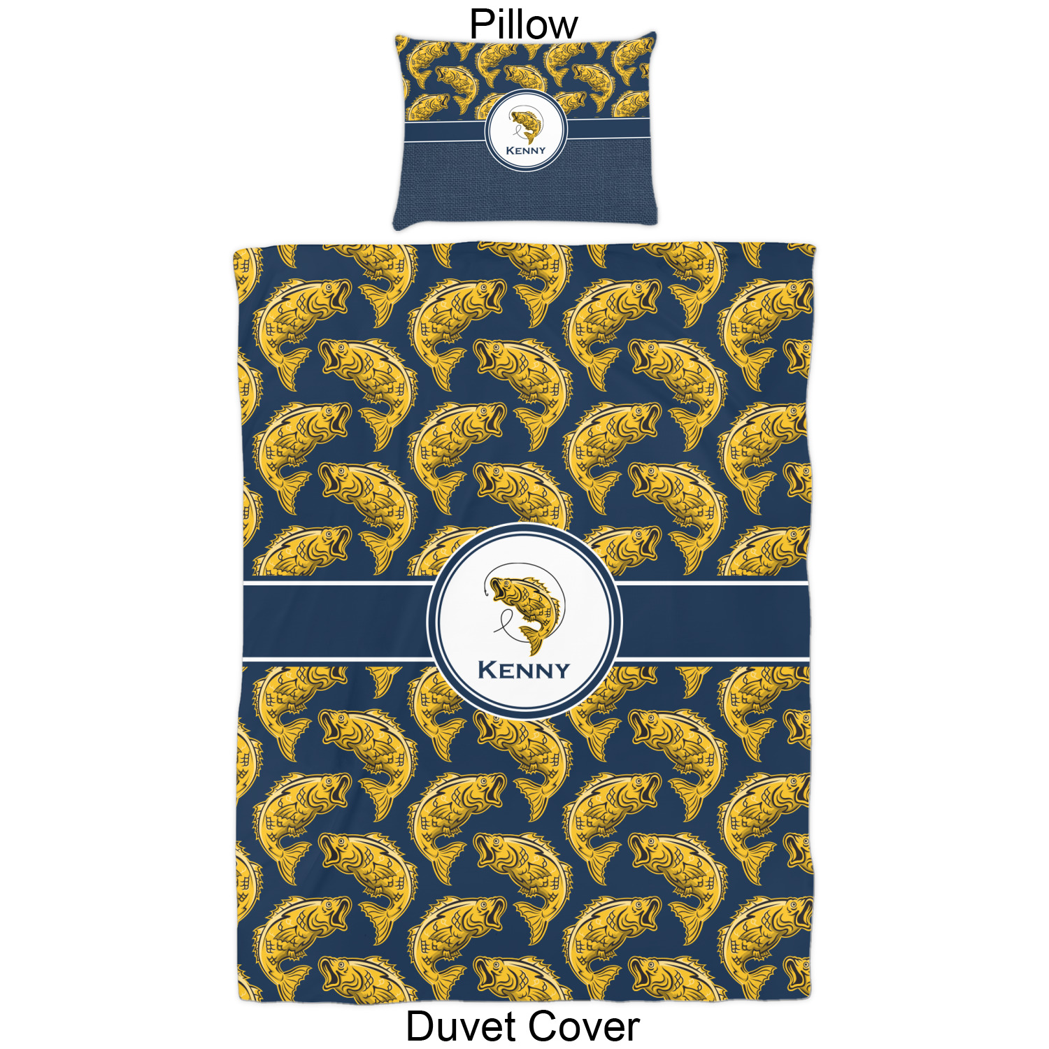 This Fish Design is perfect for all the fishermen in your life. The design is shown with yellow fish on a navy blue background. However, both the background and fish colors can be changed Through the center of the design, there is ribbon with a label. The label contains a fish and hook graphic, but this graphic can be changed to a different fish or other graphic. Just like the fish and background, the ribbon and label color can be customized.