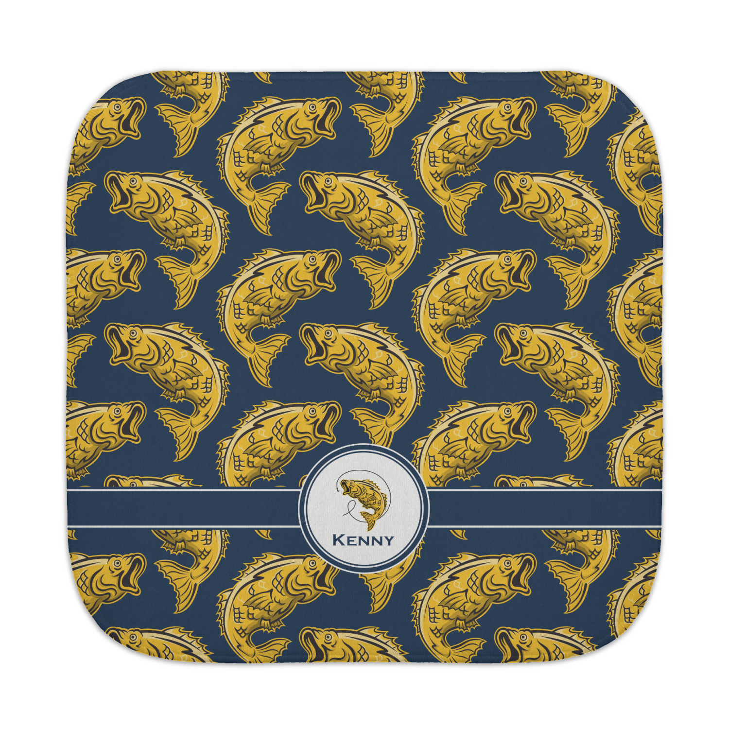 This Fish Design is perfect for all the fishermen in your life. The design is shown with yellow fish on a navy blue background. However, both the background and fish colors can be changed Through the center of the design, there is ribbon with a label. The label contains a fish and hook graphic, but this graphic can be changed to a different fish or other graphic. Just like the fish and background, the ribbon and label color can be customized.