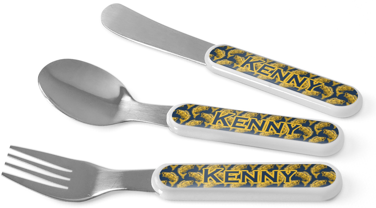This set of kids' silverware includes a 5.5 inch spoon, fork, and knife, catered to your little one's needs. The prongs of this fork are flat and dull, while our spoon is small enough for tiny mouths, and the dullness of the knife itself resembles a butter knife, at most. These kids' utensils are made of stainless steel, while the handles are crafted from a durable plastic that will withstand the energy and use of your young one. We print your customization across the handles, making the cutlery set unique to your child only.