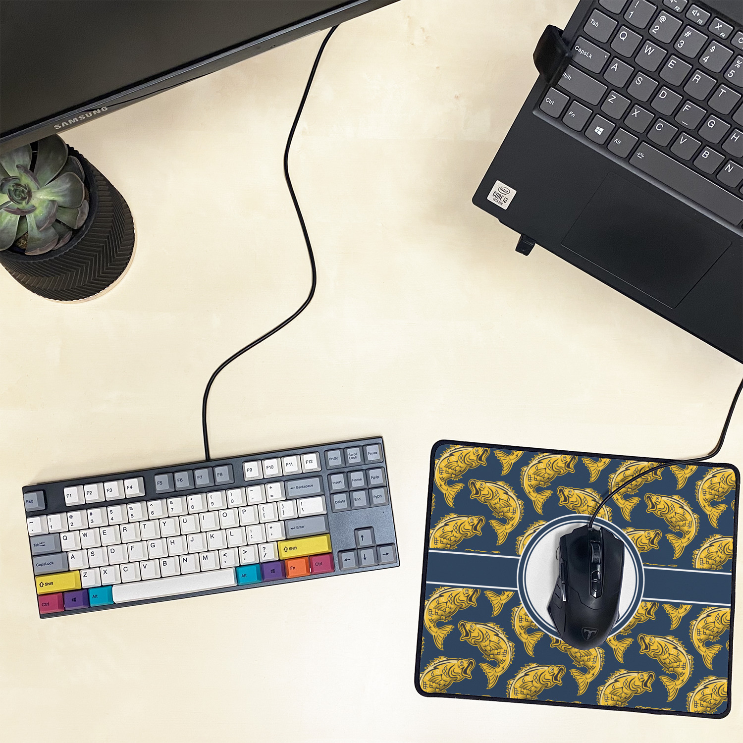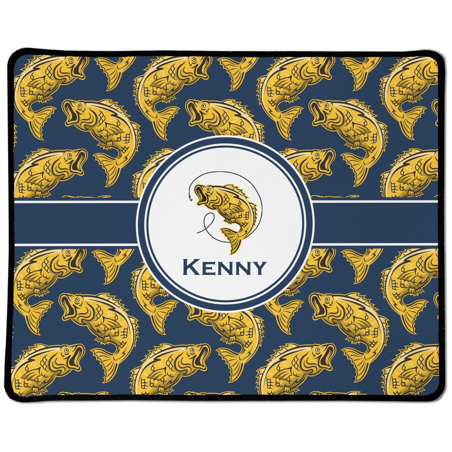 This Fish Design is perfect for all the fishermen in your life. The design is shown with yellow fish on a navy blue background. However, both the background and fish colors can be changed Through the center of the design, there is ribbon with a label. The label contains a fish and hook graphic, but this graphic can be changed to a different fish or other graphic. Just like the fish and background, the ribbon and label color can be customized.
