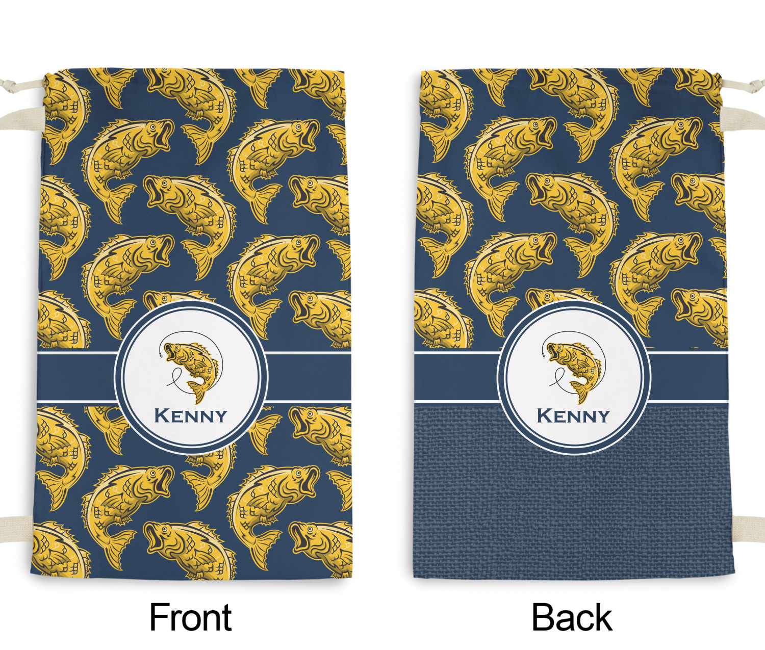 This Fish Design is perfect for all the fishermen in your life. The design is shown with yellow fish on a navy blue background. However, both the background and fish colors can be changed Through the center of the design, there is ribbon with a label. The label contains a fish and hook graphic, but this graphic can be changed to a different fish or other graphic. Just like the fish and background, the ribbon and label color can be customized.