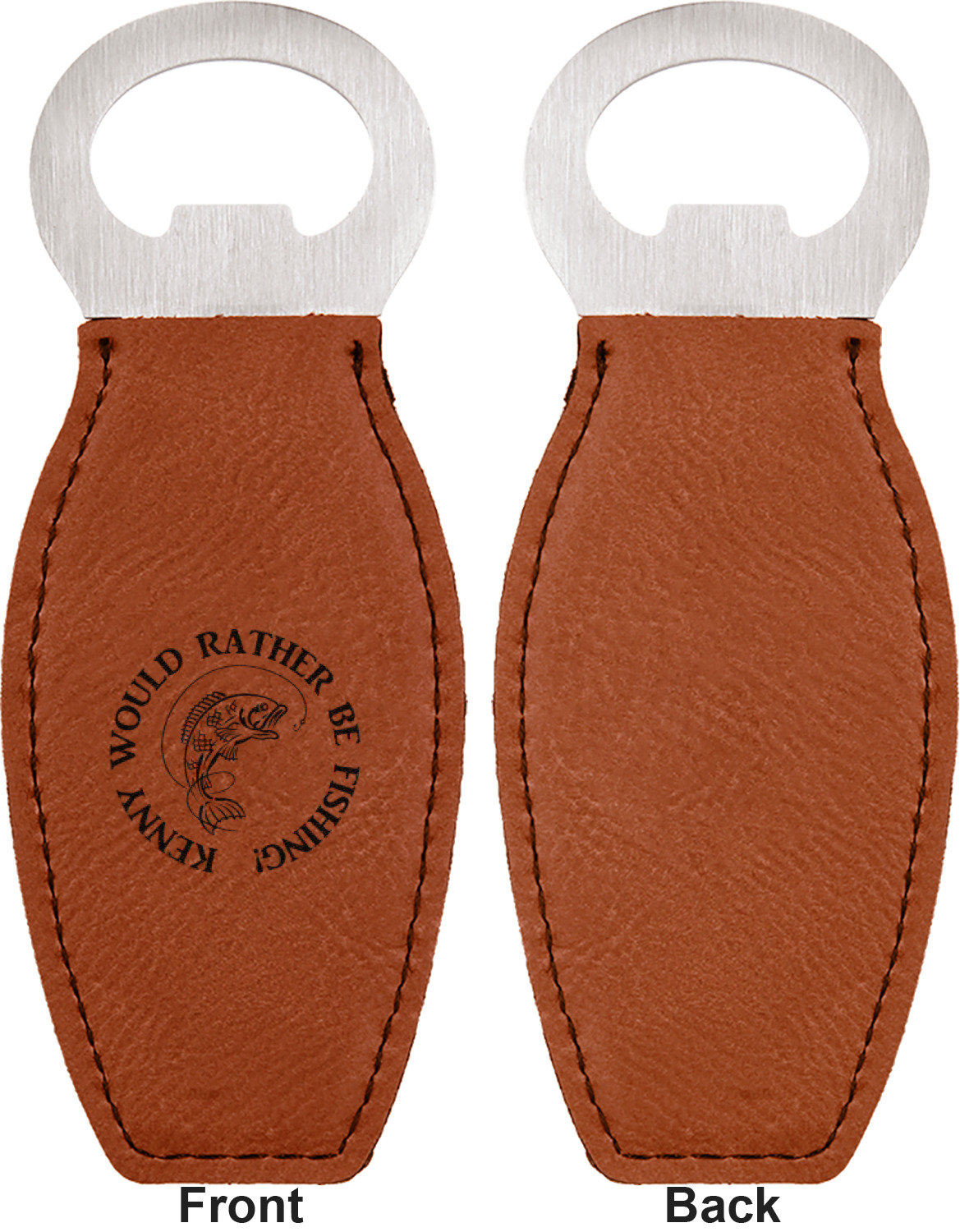 Built from stainless steel, these custom bottle openers are wrapped in a cognac-colored leatherette. Sharp, black stitching lines the edges for extra durability and a finished touch. Your personalization is laser-engraved onto the surface of this leatherette, leaving behind a crisp, black coloration. At 4.6 by 1.8 inches, this beer bottle opener gives you much of leverage when trying to open a stubborn bottle. On the opposite end of the opener, you'll find a magnet that you can use to display your new, unique bottle opener!