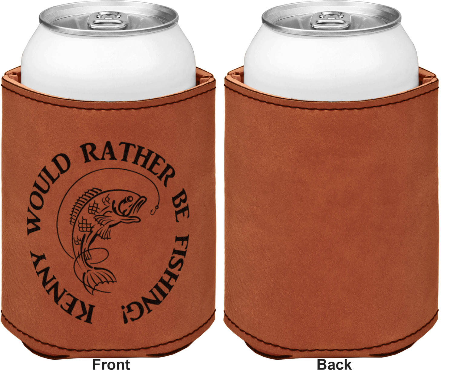 This can sleeve is made from a cognac-brown leatherette and stitched with a sturdy, black thread. A slim padding lines the inside of your can sleeve to allow for a better fit once your drink is inserted. The sleeve itself measures at 4 by 4.5 inches, allowing this custom can sleeve to accommodate most canned drinks. Your personalized design can be engraved on the front and back, or solely the front. When laser-engraved, your design appears as a black coloration which contrasts the leatherette nicely.