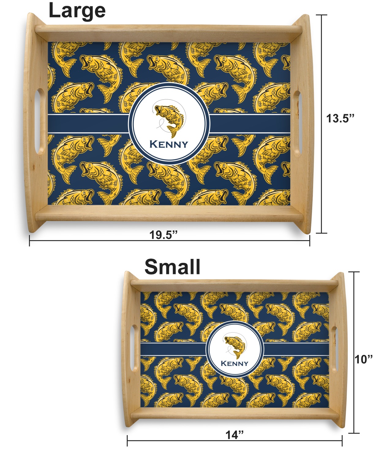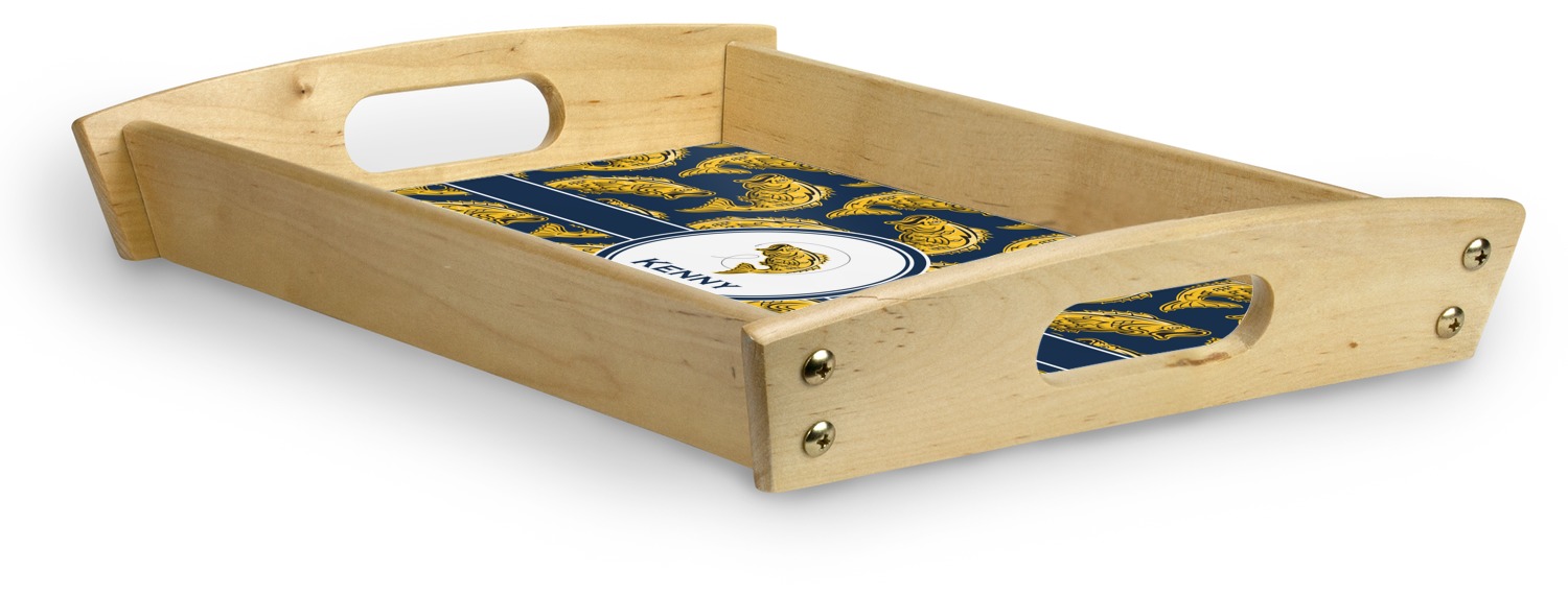 This serving tray with handles features square edges and two rounded sides, creating a very modern look. Each side is fabricated from a beautifully cut, natural wood. The bottom of the interior of the tray displays your customized design in bright, vibrant color. The tray is sold in both a black color and a natural wood look. Each variation of the wood serving tray has two sizes: Small, which is 14" x 10" x 2.25", and Large, which is 19.5" x 13.5" x 2.75".