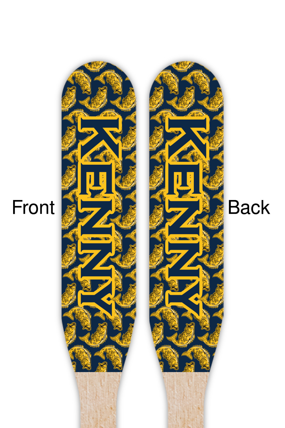 This Fish Design is perfect for all the fishermen in your life. The design is shown with yellow fish on a navy blue background. However, both the background and fish colors can be changed Through the center of the design, there is ribbon with a label. The label contains a fish and hook graphic, but this graphic can be changed to a different fish or other graphic. Just like the fish and background, the ribbon and label color can be customized.