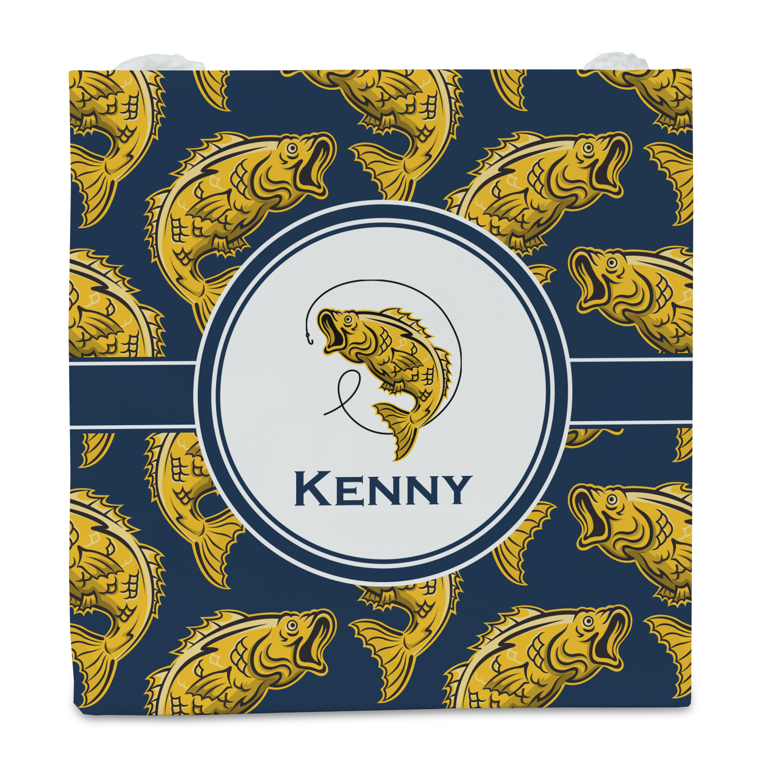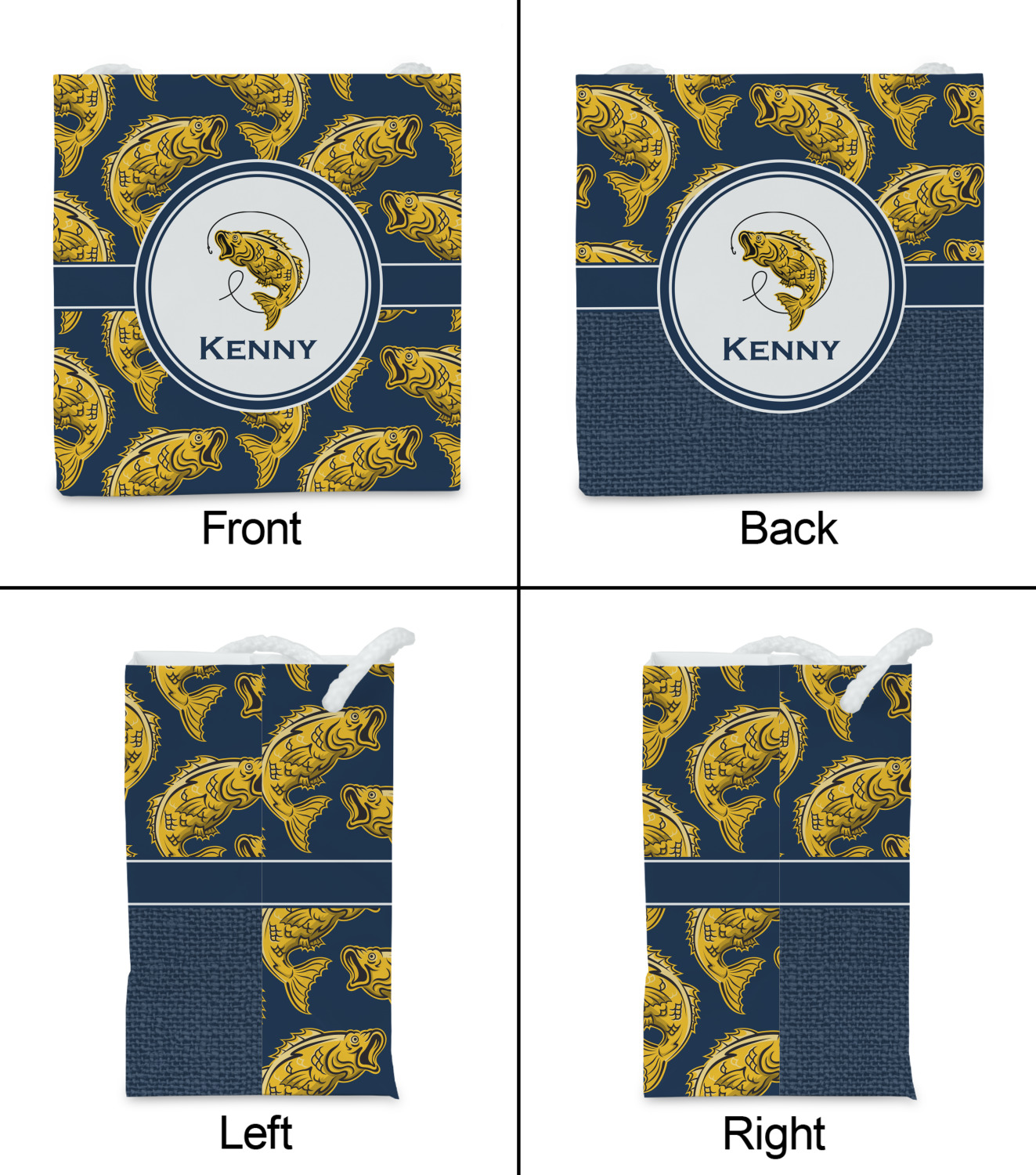 This Fish Design is perfect for all the fishermen in your life. The design is shown with yellow fish on a navy blue background. However, both the background and fish colors can be changed Through the center of the design, there is ribbon with a label. The label contains a fish and hook graphic, but this graphic can be changed to a different fish or other graphic. Just like the fish and background, the ribbon and label color can be customized.